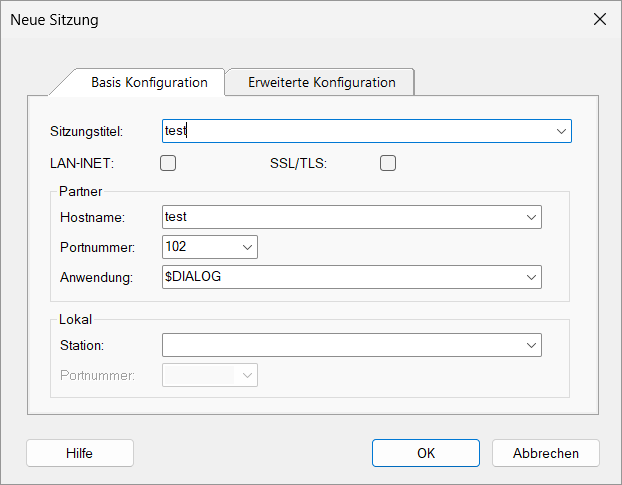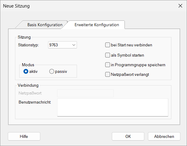 Richten Sie eine neue Sitzung mit dem Menüelement "Sitzung" → "Neu" oder dem "Neu"-Symbol in der Symbolleiste ein. Das Dialogfenster "Neue Sitzung" wird angezeigt.