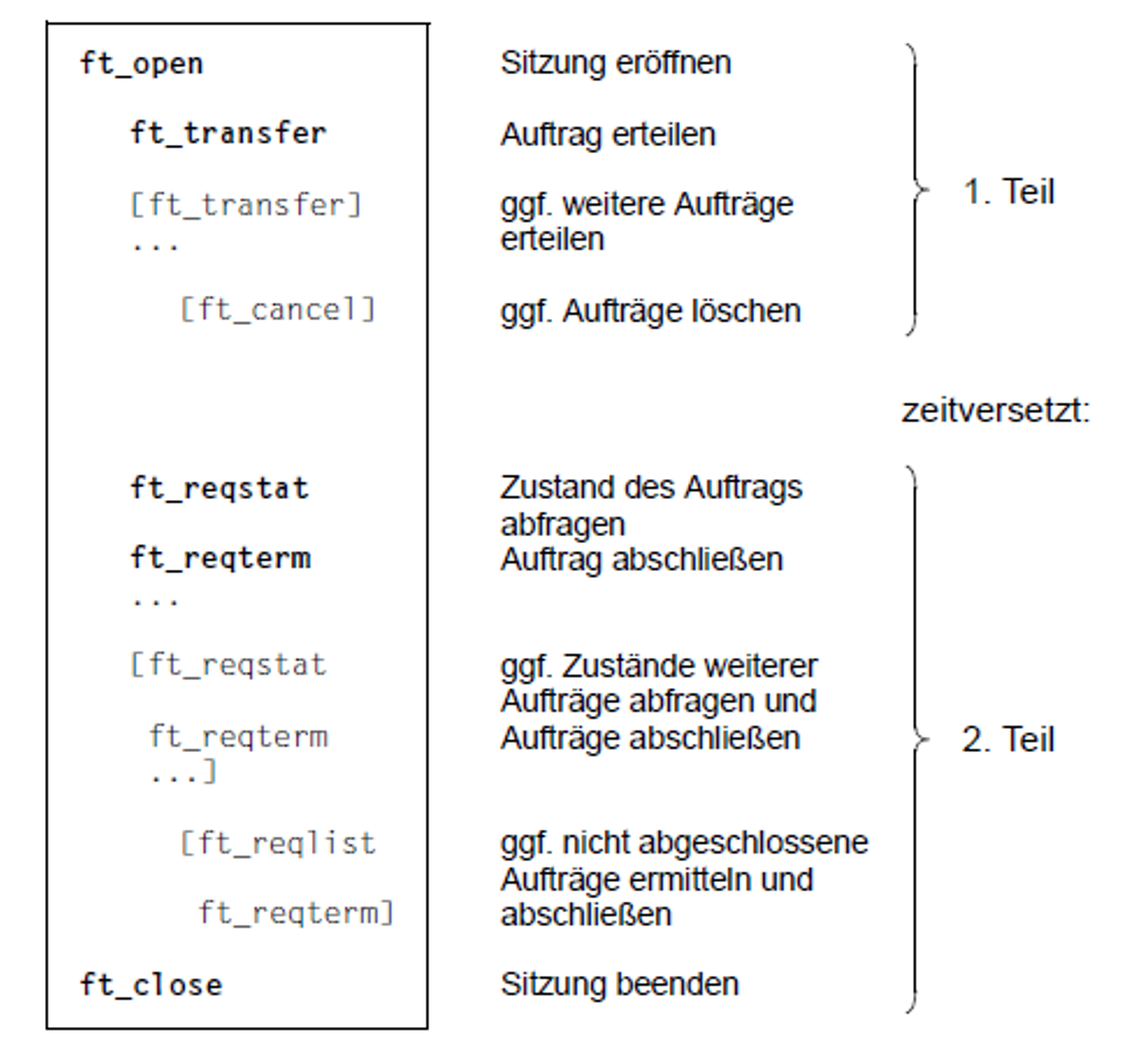 Den Auftrag selbst führt openFT zum nächstmöglichen Zeitpunkt aus.Im zweiten Teil erfragen Sie zeitversetzt den Status des Auftrags und schließen den Auftrag bei erfolgreicher Übertragung ab. Ggf. ermitteln Sie nicht abgeschlossene Übertragungsaufträge und schließen diese ebenfalls ab. Sie beenden die Sitzung.