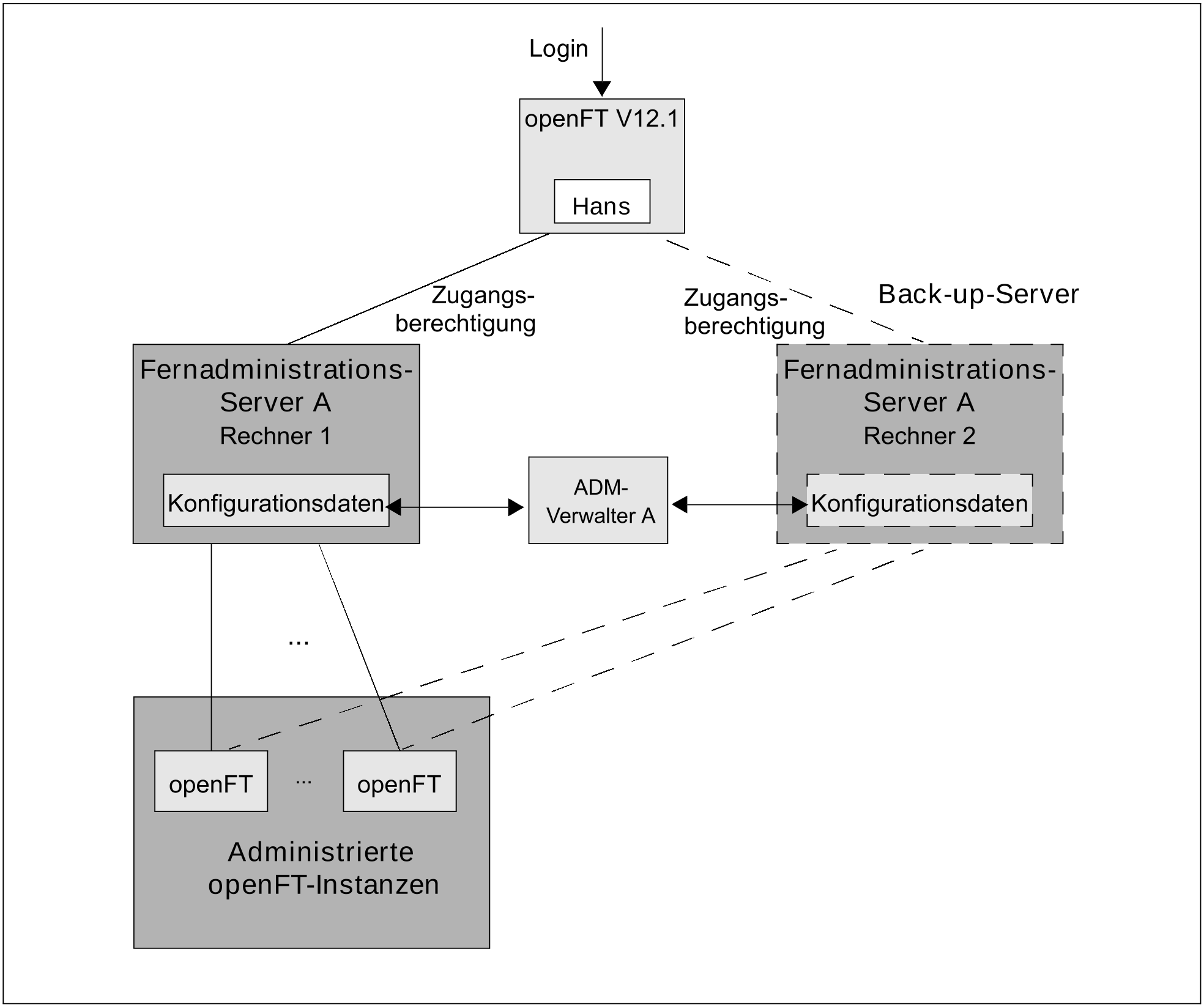 Daher sollten Sie vor allem bei komplexen Konfigurationen die Ausfallsicherheit des Fernadministrations-Servers mit Hilfe eines Clusters realisieren. Beispiele für das Einrichten eines Clusters finden Sie im Handbuch "openFT (Unix- und Windows-Systeme) - Installation und Betrieb".