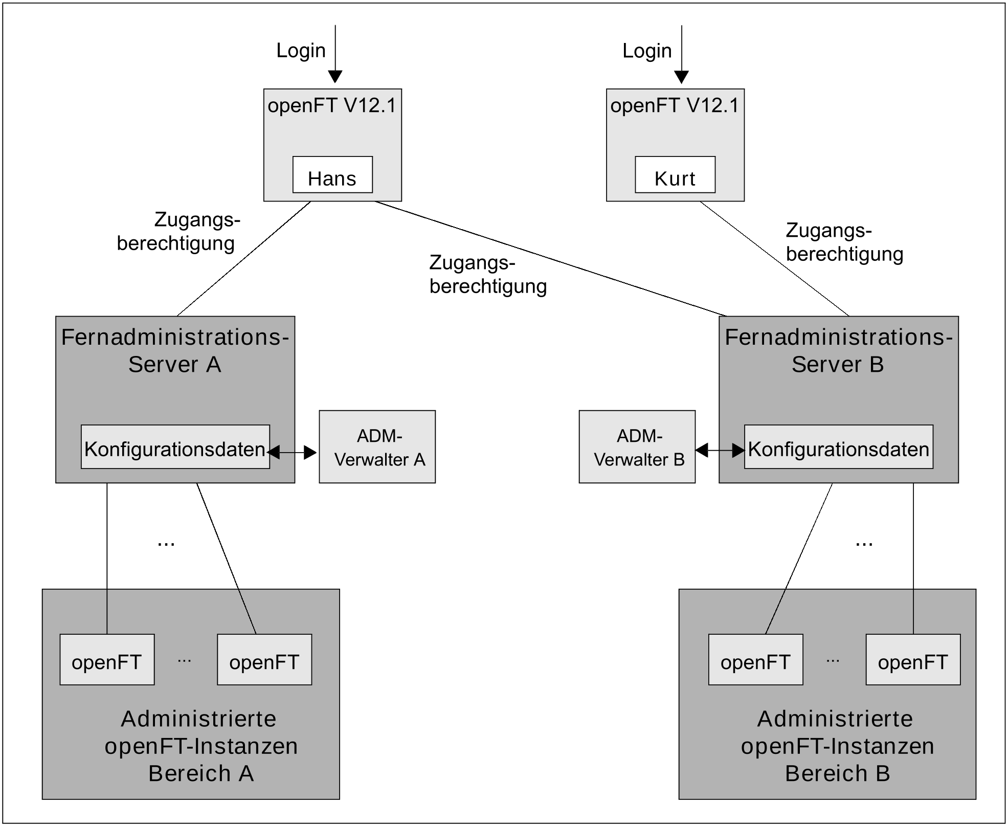 Bereich A und B sind zwar strikt getrennt, aber Hans darf Instanzen aus den Bereichen A und B administrieren, Kurt dagegen nur aus dem Bereich B.