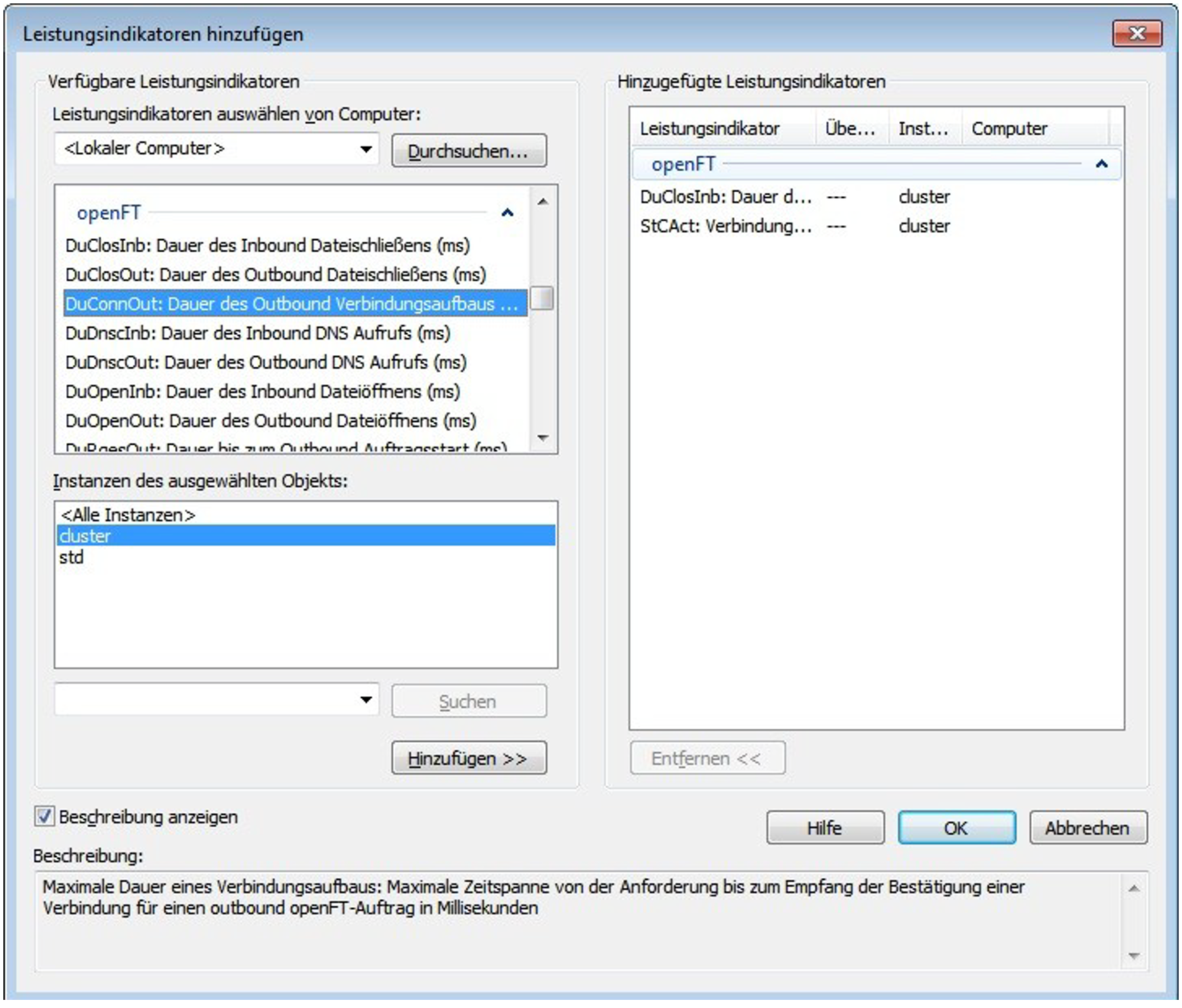 Im Fenster Leistungsindikatoren hinzufügen finden Sie unter Verfügbare Leistungsindikatoren die Rubrik openFT. Wählen Sie die gewünschten openFT-Messwerte und ggf. die openFT-Instanz aus und klicken Sie auf die Schaltfläche Hinzufügen >>. Die Messwerte werden rechts unter Hinzugefügte Leistungsindikatoren aufgelistet.