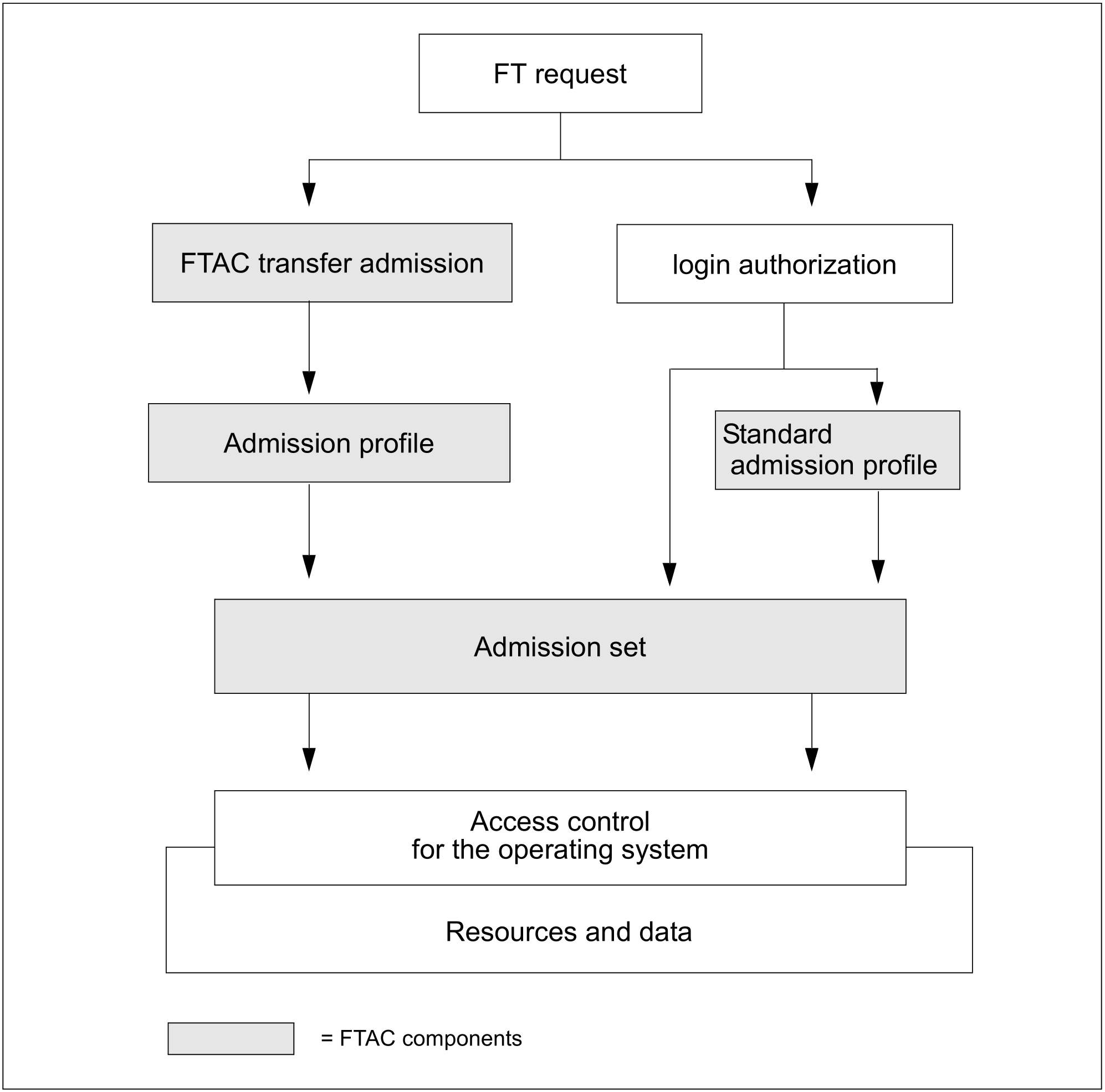 The admission profile (or FT profile) defines the FTAC transfer admission and the associated access rights. The FTAC transfer admission (simply referred as transfer admission) is the actual key to your computer. You should therefore treat the transfer admission with the same care as you look after a password. It must be specified in transfer requests instead of a login authorization. The standard admission profile for a user ID is an exception. See "Admission profile (FT profile)". Anyone who possesses this transfer admission does have file transfer access to your computer, but, unlike the login authorization, is not free do what he or she wants. Which functions you permit are specified with the access rights for this transfer admission. In this way, you can control (for example):