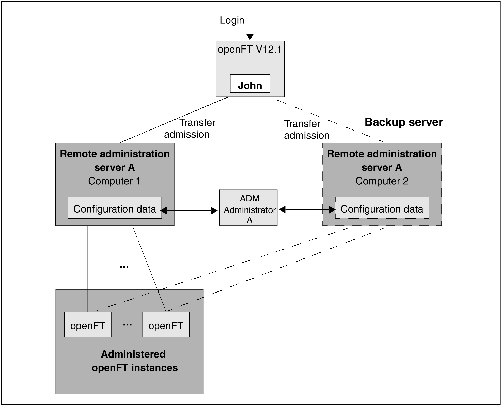 For this reason, with complex configurations in particular, you should implement failsafe protection of the remote administration server using a cluster. You can find examples of how to set up a cluster in the manual "openFT (Unix and Windows systems) - Installation and Operation".