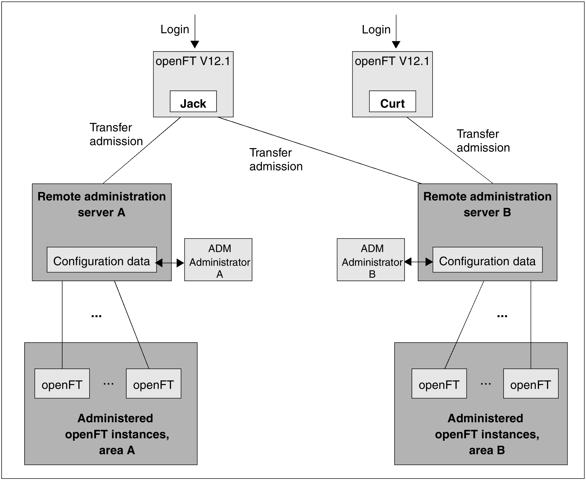 Complex configurations can also be defined in which remote administrators access multiple remote administration servers.