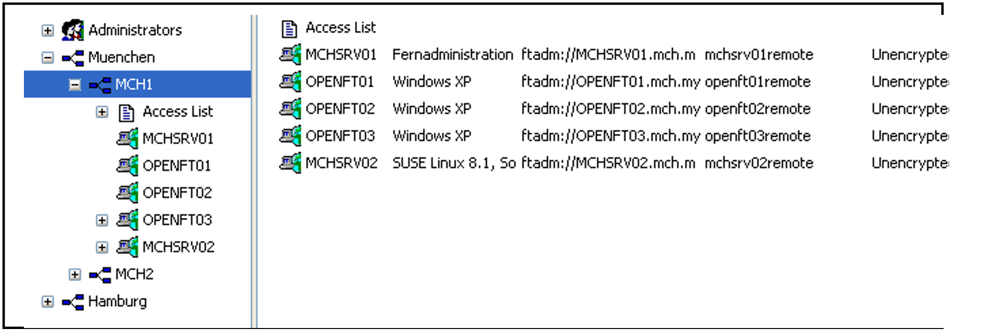 The representation of the configuration corresponds to the display you will subsequently see under Remote Administration in the openFT Explorer, see the example under section “Creating a configuration file using the Configuration Editor”.