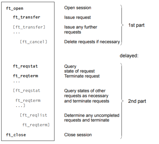 Several functions are necessary in order to perform synchronous file transfer. They result from the fact that, with asynchronous file transfer requests are issued, stored in the request queue and possibly not executed until later. The requests must be administered and the successful transfer must be monitored. It is therefore only possible to transfer files asynchronously within "sessions".