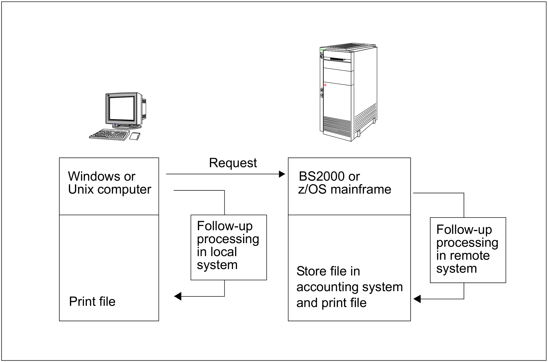 In the headquarters of a supermarket chain, there is a mainframe computer running BS2000 or z/OS. The branch office has Windows or Unix workstations. Every Saturday, the branch manager issues a request to transfer the file that contains a prepared list of the weekly sales. This file is transferred to the processor at the headquarters using openFT. The follow-up processing for the transfer request specifies that the file should be printed on the mainframe and then deleted from the branch computer if file transfer is successful.