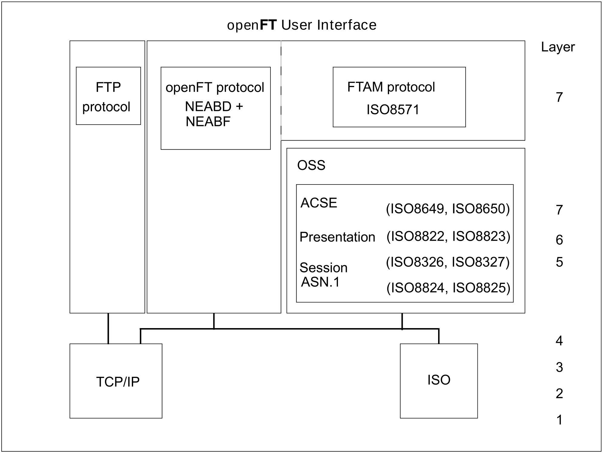 The openFT products belong to the application layers (Layers 5 - 7) of the OSI Reference Model. They support the standardized openFT protocol and the FTAM protocol ISO8571 standardized by ISO and the File Transfer Protocol (FTP) defined by RFC959.