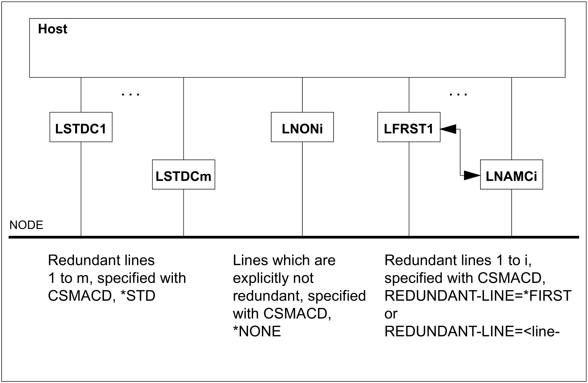 Also groups and subgroups of redundant lines can be created with BCAM, thereby enhancing the definition of redundant configurations. This enables you to specify precisely which lines to a node are to be regarded as redundant and which lines are not to take part explicitly in a switchover. Groups of lines which are redundant among themselves can thus be formed on a node. The subgroup is used to control which lines are to be used preferentially as alternatives.