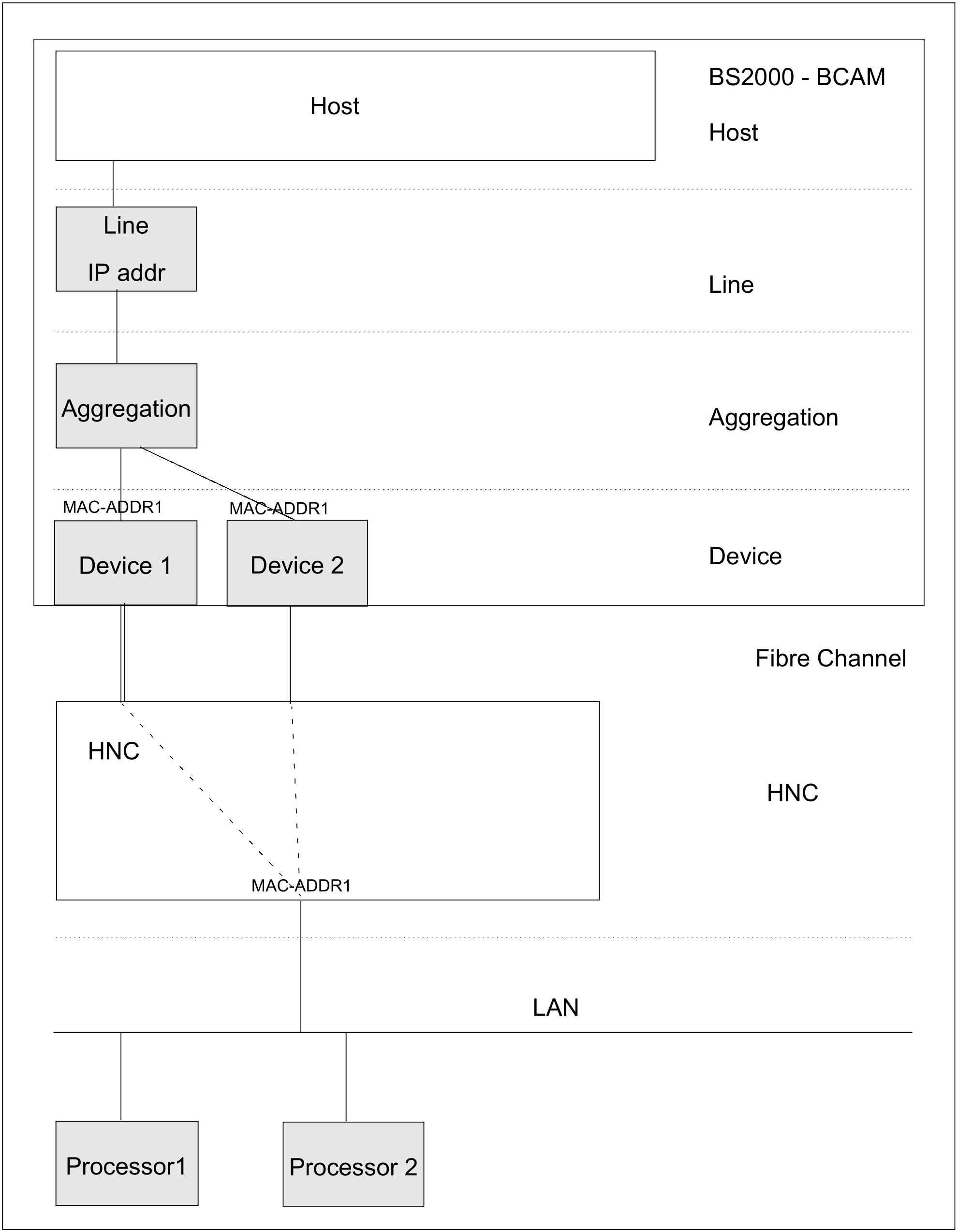 With link aggregation (line aggregation) BCAM provides a number of functions which support high-performance and reliable network operation. Link aggregation is offered only for Fibre Channels. A suitable power supply is required to use link aggregation. Use of link aggregation cannot be recognized by the communications partners. BS2000 requires only a MAC address and an IP address.