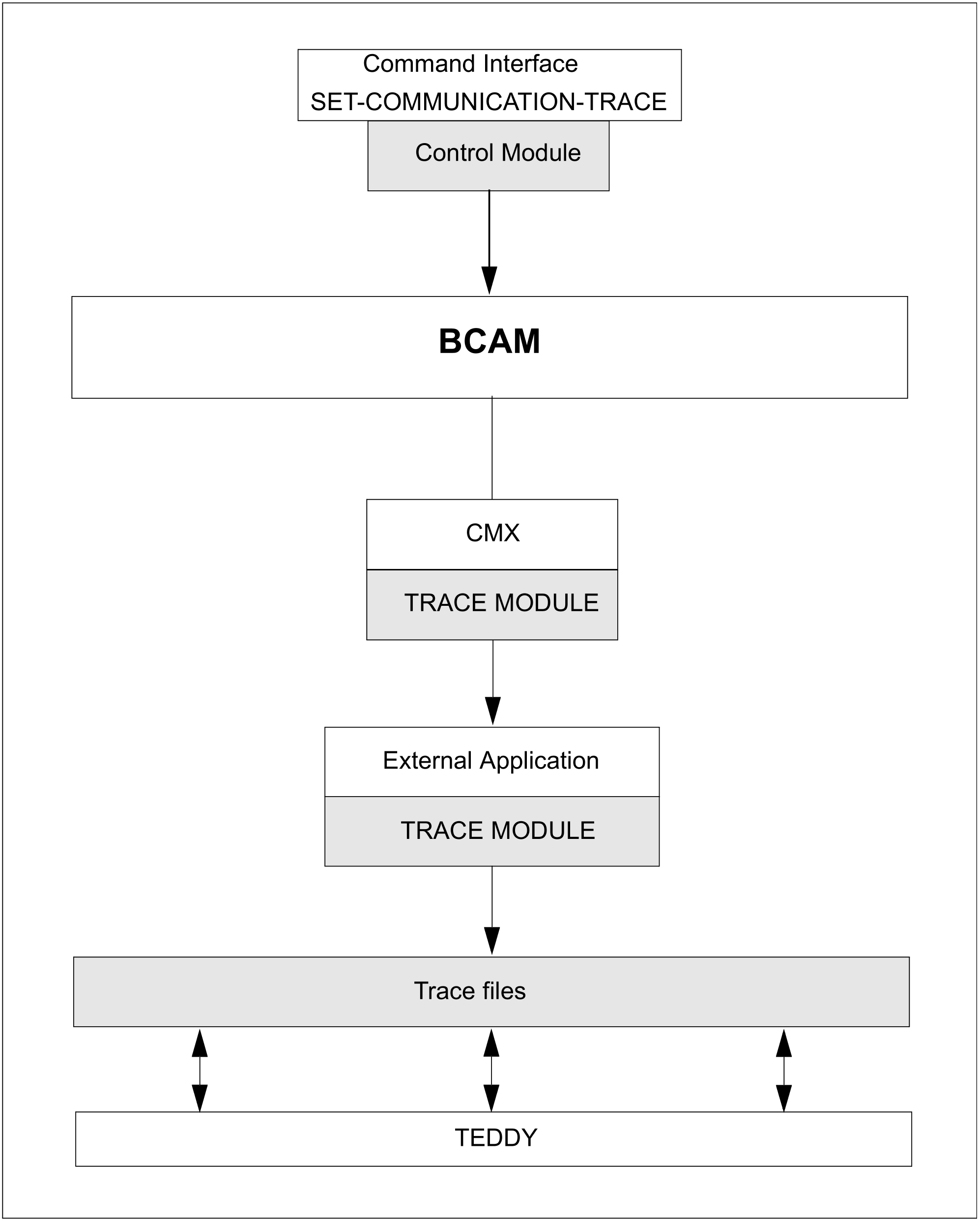 DCM-DIAG is a subsystem that essentially consists of a command interface (SET-COMMUNICATION-TRACE) and a trace module. As of BCAM V14, the trace module is linked into CMX. For external applications, the trace module is offered for linkage in the respective application. The trace module can only be used in external applications, provided the CMX communication component is also used by these external applications.