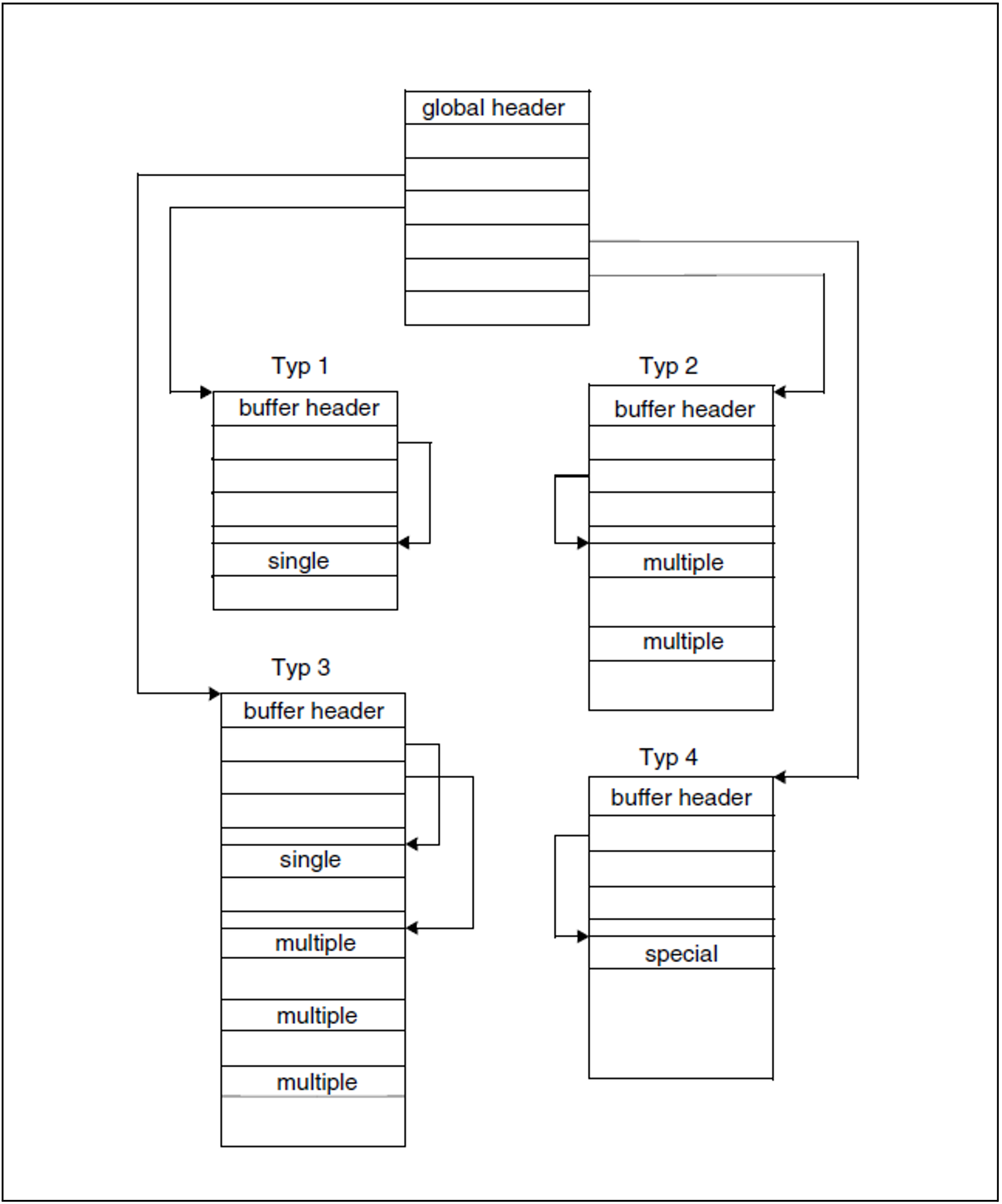 Typ 1 | Der Datenbereich hat eine feste Länge (in der Abbildung als „single“ gekennzeichnet). Bei diesem Typ liefert das Element „fixed_part_dsp“ des BUFFER HEADERs die Distanz des Datenbereiches vom Anfang des BUFFER HEADERs. Datenpuffer: ACF, BASIC, DLM, HSMS, MEMORY, MSCF, NSM, POSIX |