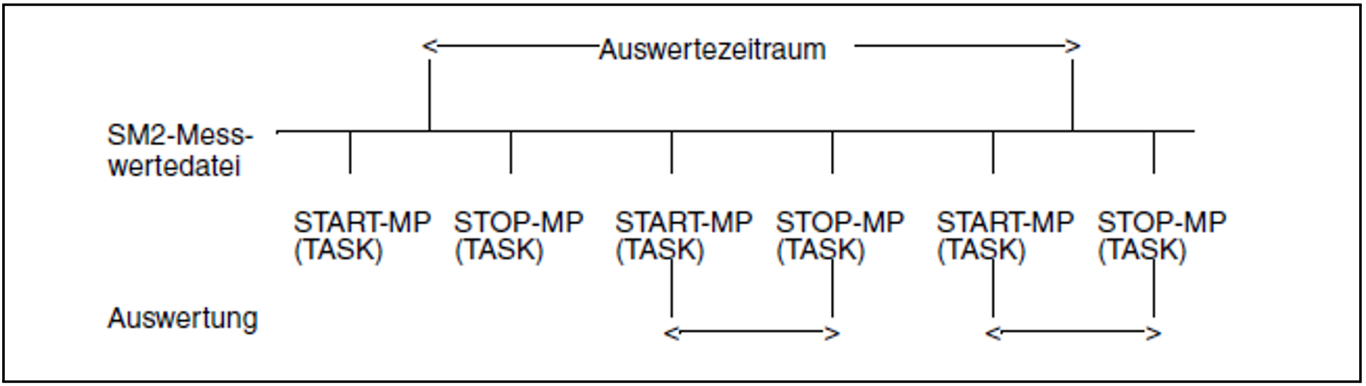 Voraussetzung für die Task-Auswertung ist, dass während der Messung mit SM2 das Messprogramm TASK eingeschaltet war. Die Task-Datensätze werden in der SM2-Messwertedatei durch einen START-MP-Satz eingeleitet und enden mit einem STOP-MP-Satz für die Task-Statistik.