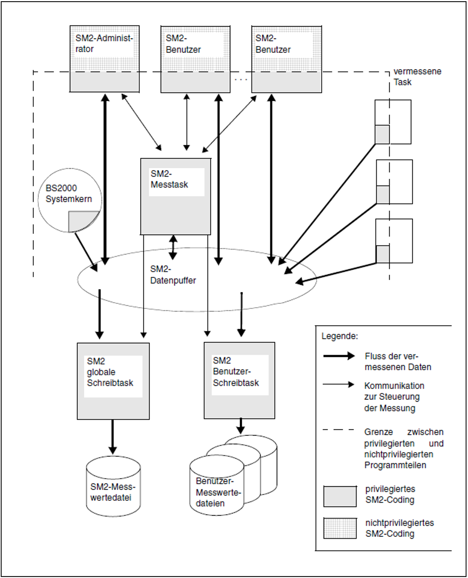 SM2 besteht aus einem privilegierten Subsystem und einem nichtprivilegierten Benutzerprogramm. Das Subsystem SM2 erzeugt mehrere System-Tasks, die für die Datenermittlung und das Schreiben der Daten in die SM2-Dateien zuständig sind.