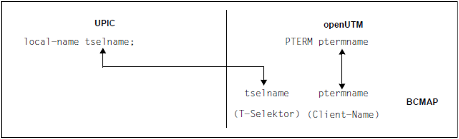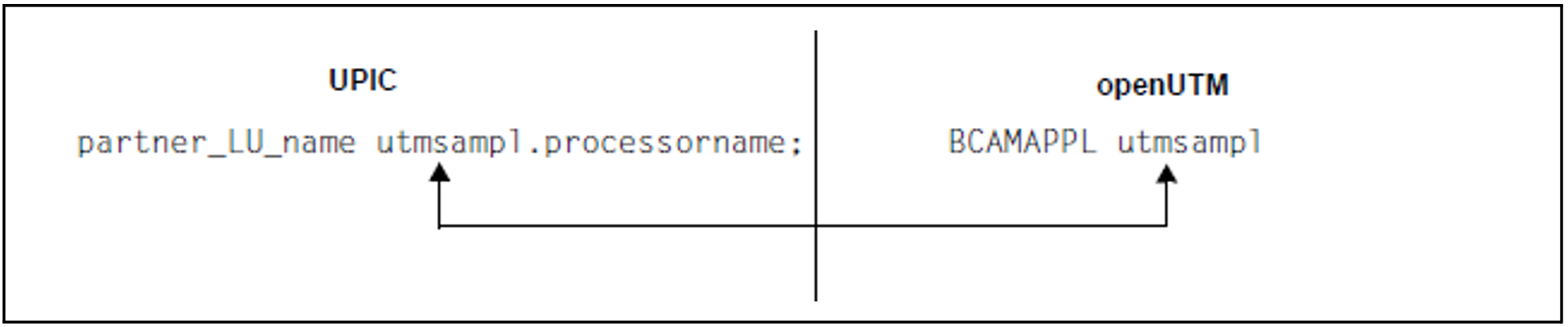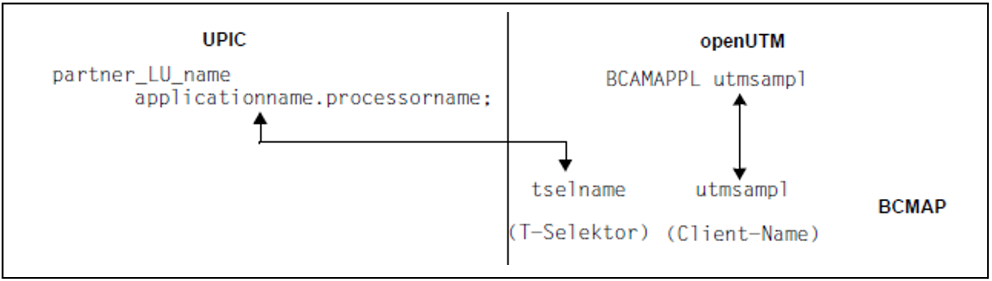 Der applicationname, den UPIC an das Transportsystem übergibt, muss dann mit dem BCAMAPPL-Namen der UTM-Anwendung übereinstimmen, über den die Verbindung mit dem Client aufgebaut wird (im Bild utmsampl). processorname muss im TCP/IP Name Service als Name des fernen Rechners eingetragen sein.