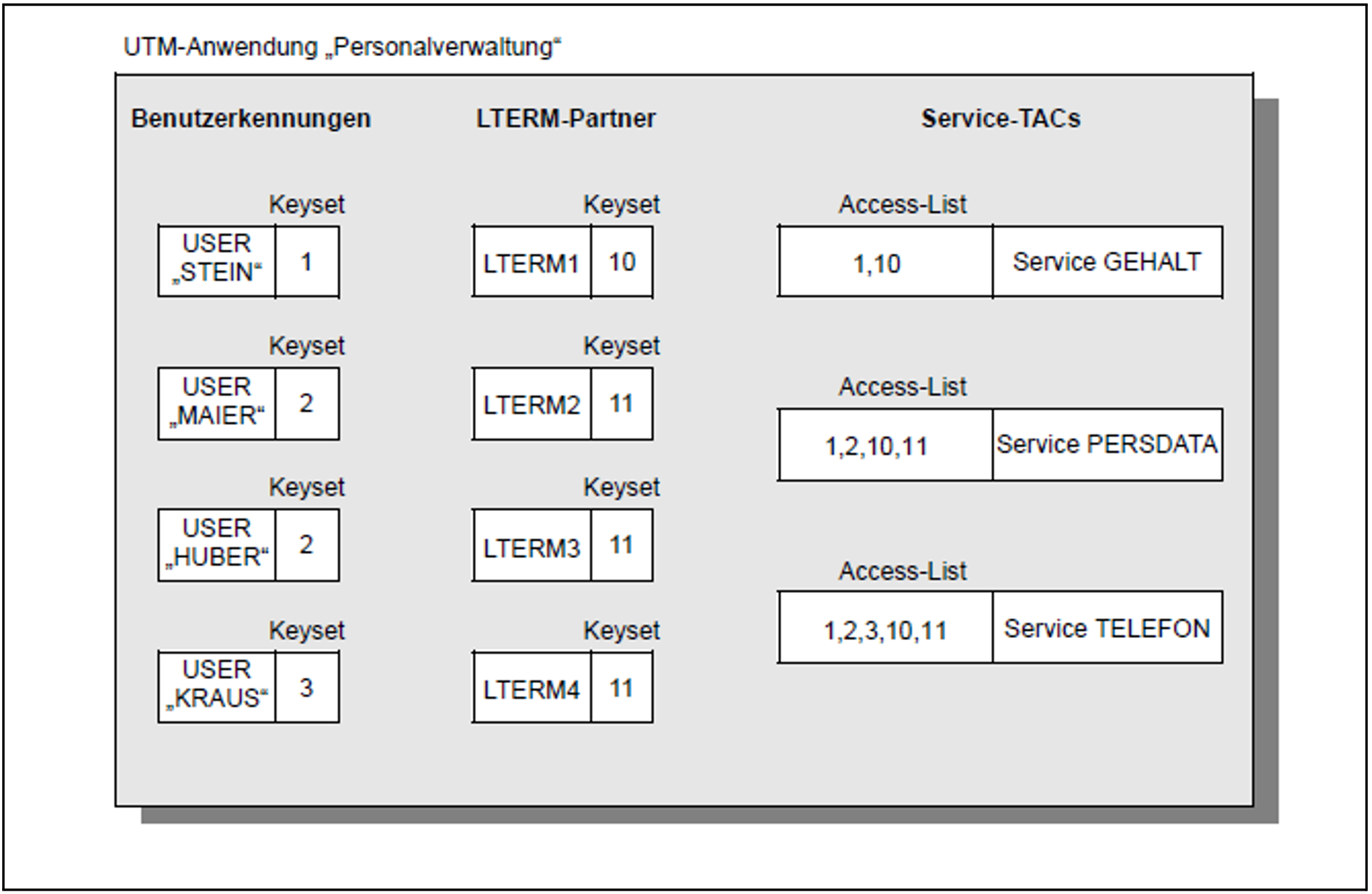 Ein Benutzer darf einen Service nur dann starten, wenn das Keyset der Benutzerkennung und das Keyset des LTERM-Partners, über den er sich anmeldet, einen Key enthalten, der in der Access-List des Services enthalten ist: