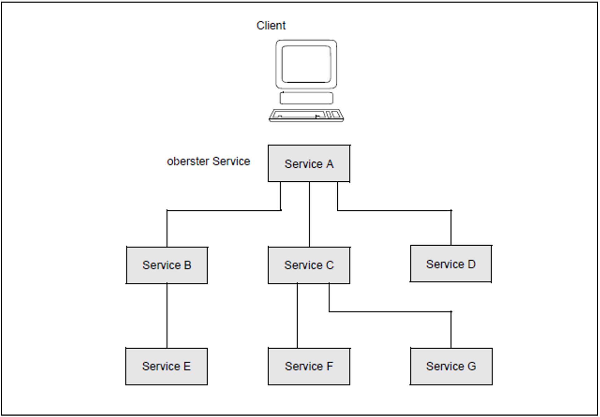Aus dem folgenden Bild ist ersichtlich, dass ein Service gleichzeitig die Rolle des Auftragnehmer-Service wie auch die eines Auftraggeber-Service einnehmen kann. Die Services B, C und D sind Auftragnehmer-Services gegenüber Service A, die Services B und C sind zugleich Auftraggeber-Services gegenüber den Services E bzw. F und G auf der untersten Ebene.