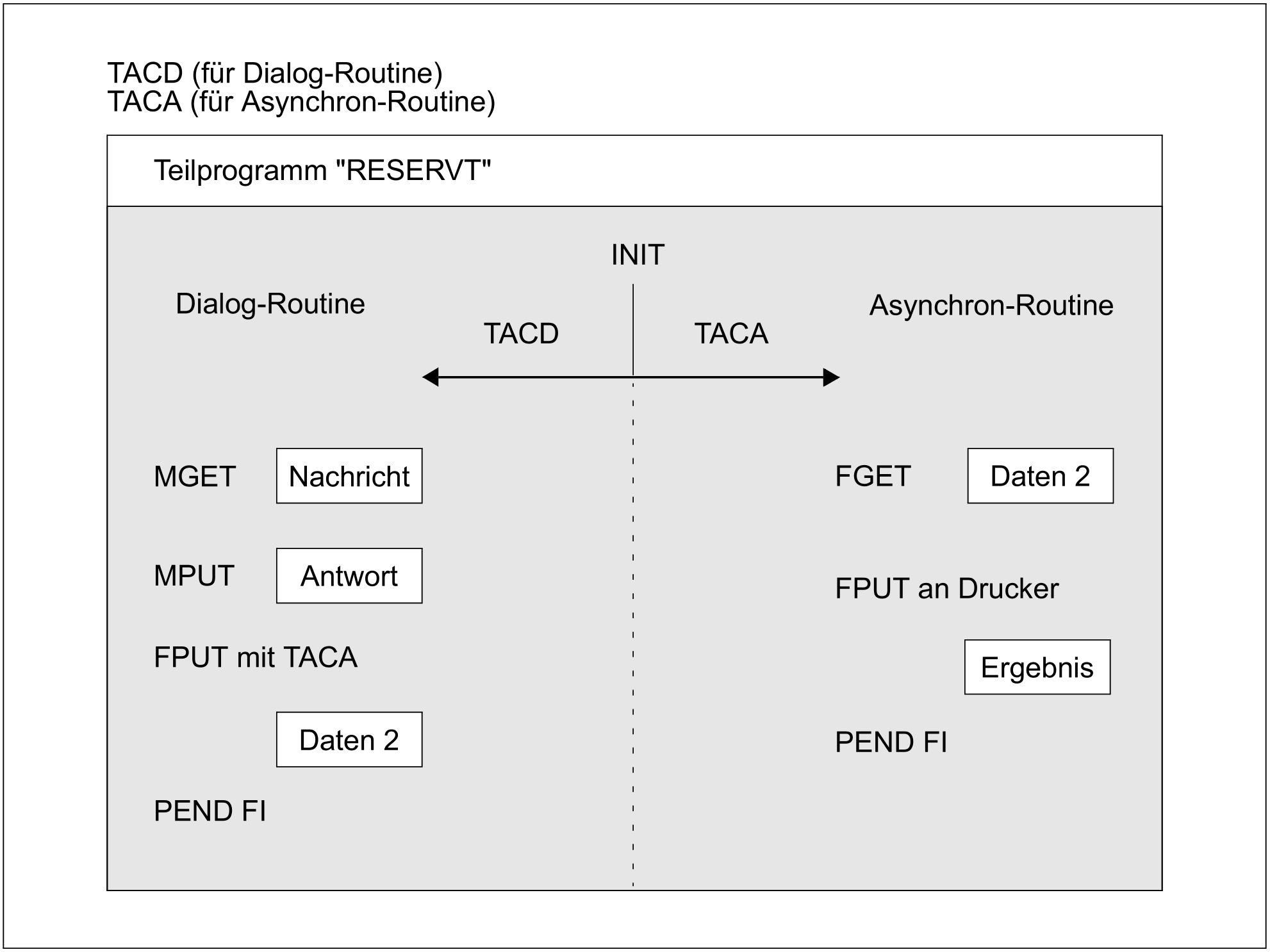Wird das im Bild dargestellte Programm mit TACD gestartet, wird nach dem PEND der FPUT ausgeführt, wodurch das gleiche Teilprogramm noch einmal gestartet wird, um einen unabhängigen 2. Vorgang zu bearbeiten. Für ein Dialog-Programm bedeutet die Auslagerung eines Asynchron-Vorgangs u.U. bessere Antwortzeiten für den Dialog mit dem Client.