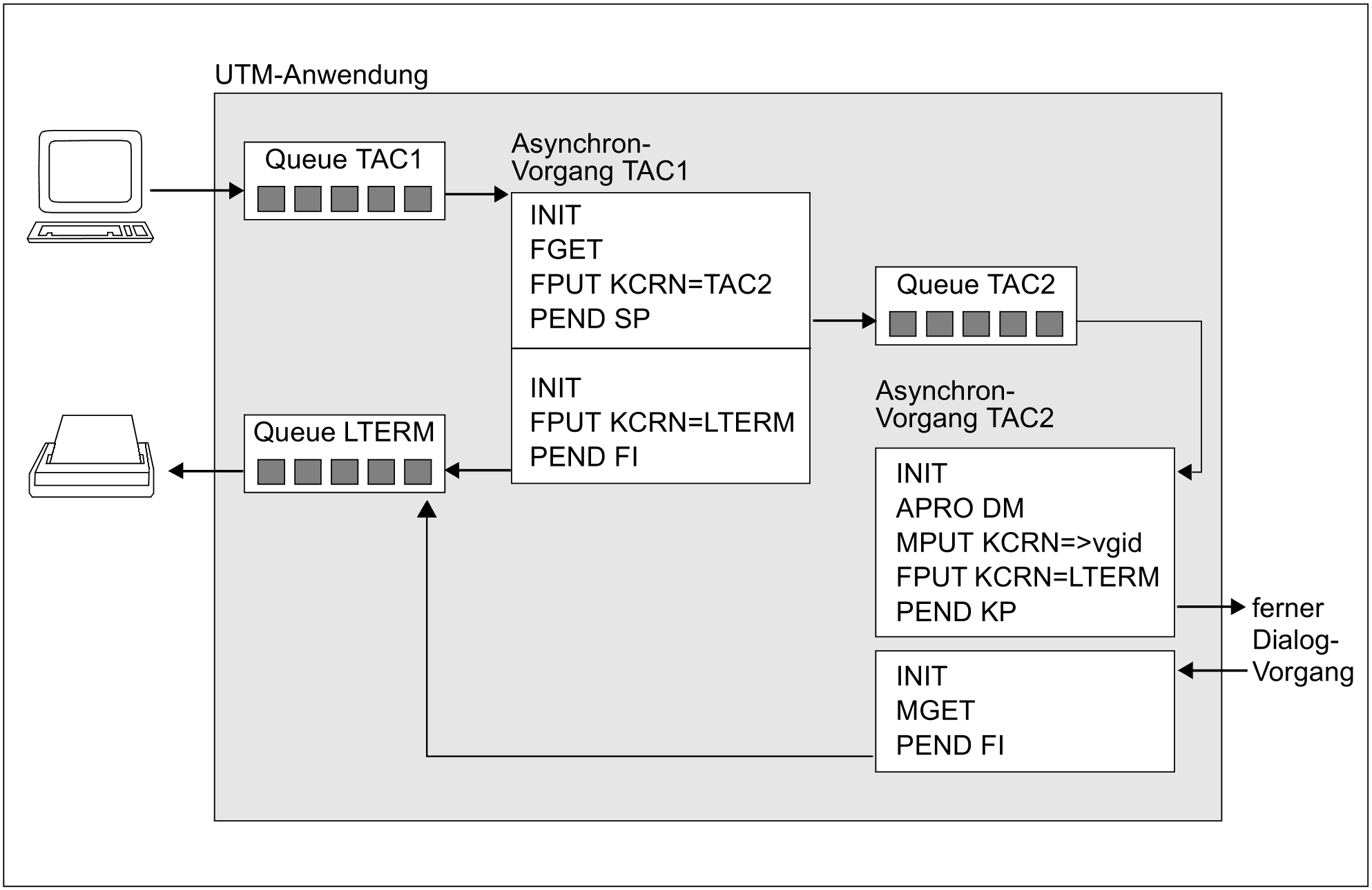 Im dargestellten Beispiel wird von einem Terminal aus ein Hintergrund-Auftrag an einen Asynchron-Vorgang der eigenen Anwendung gestellt. Hierzu wird am Terminal der Transaktionscode dieses Vorgangs und ggf. eine Nachricht eingegeben. openUTM reiht den Auftrag automatisch in die entsprechende Queue ein und startet den Asynchron-Vorgang entkoppelt vom Auftraggeber, sobald die notwendigen Betriebsmittel zur Verfügung stehen. Das erste Teilprogramm liest die Daten mit FGET ein und schließt mit PEND SP. Es wird ein Sicherungspunkt gesetzt und das in KCRN angegebene Folge-Teilprogramm gestartet.