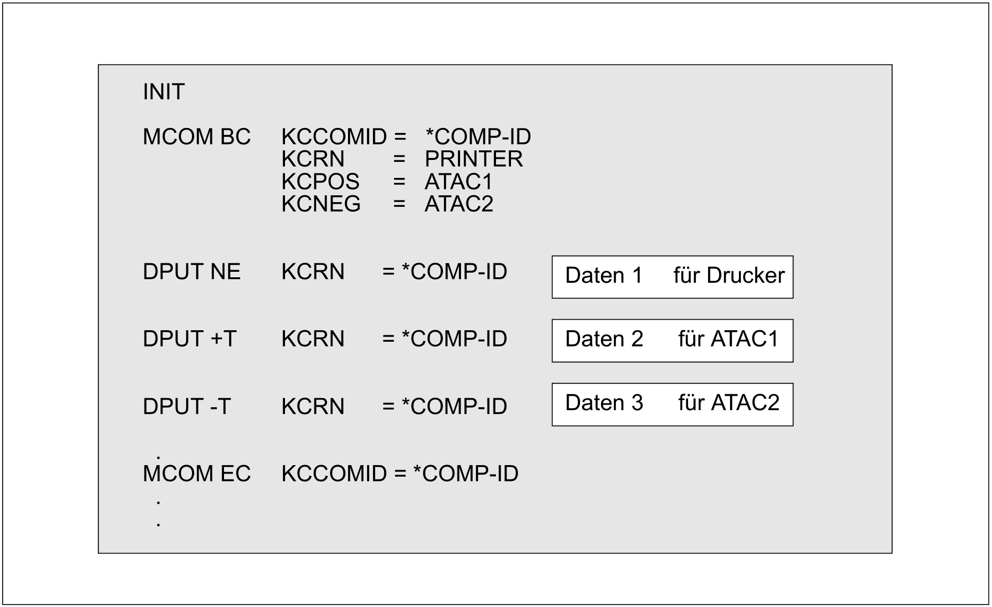 Auch im Vorgang TAC2 wird im ersten Teilprogramm ein Asynchron-Auftrag abgesetzt, ein Ausgabe-Auftrag an den Drucker. Beim FPUT muss hierfür das Feld KCRN mit dem LTERM-Namen des Druckers versorgt werden. Da das Teilprogramm nicht mit einem Sicherungspunkt endet, wird der Auftrag erst zum Vorgangsende (nächster Sicherungspunkt) in die Queue des LTERMs eingereiht.