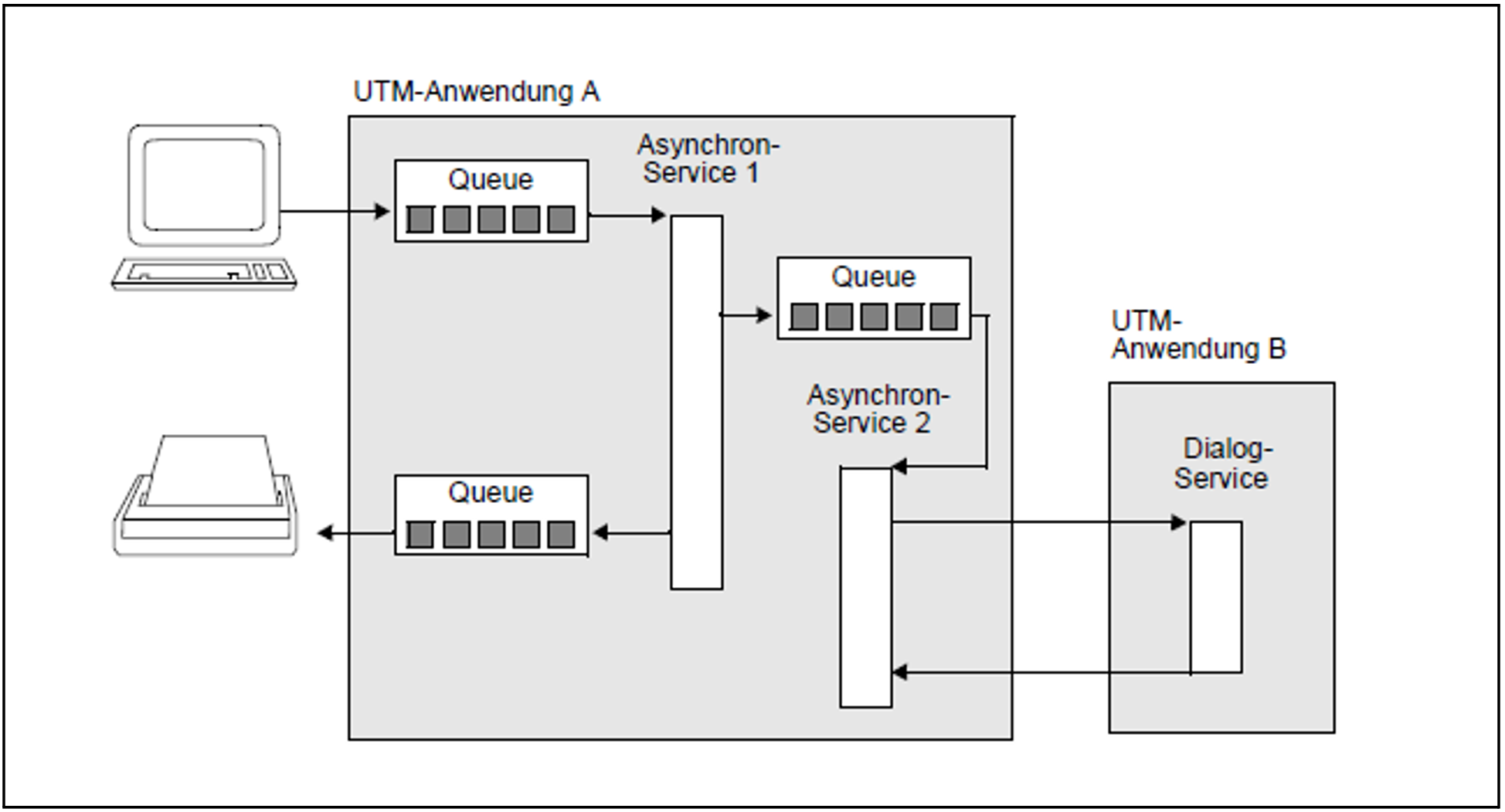 In Bild 23 wird - wie in Bild 22 - vom Terminal aus ein Hintergrundauftrag an einen lokalen Asynchron-Service gestellt. Innerhalb dieses Services wird ein weiterer Hintergrundauftrag abgesetzt sowie ein Ausgabeauftrag an einen Drucker. Der Asynchron-Service 2 seinerseits startet einen fernen Dialog-Service in der UTM-Anwendung B. Dabei kann die UTM-Anwendung B auf dem gleichen Rechner liegen wie UTM-Anwendung A oder auch auf einem anderen Rechner. Auch bei komplexeren Strukturen mit vielen unterschiedlichen Queues brauchen Sie sich um den Queuing-Mechanismus nicht zu kümmern: er wird von openUTM automatisch zur Verfügung gestellt.