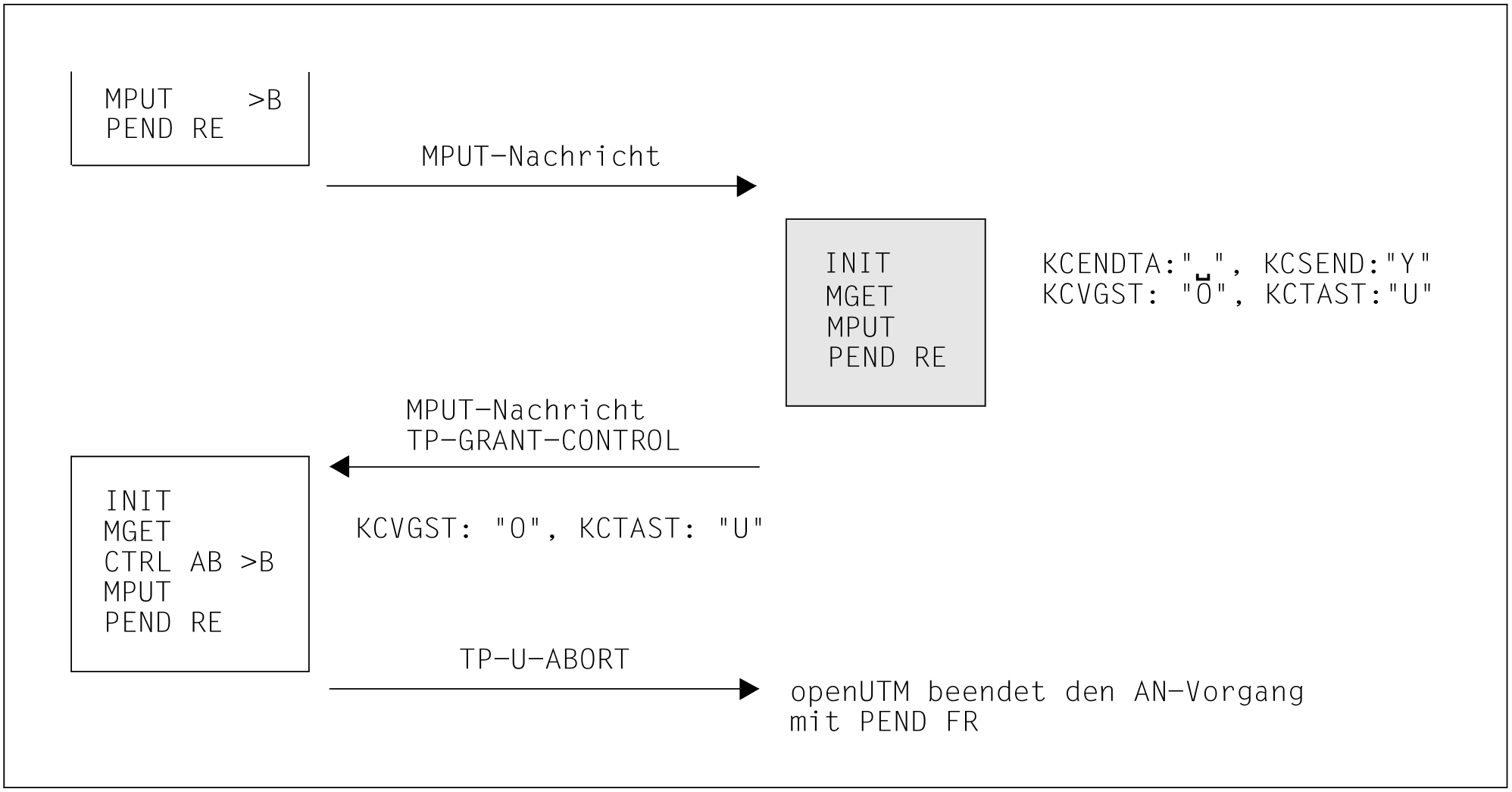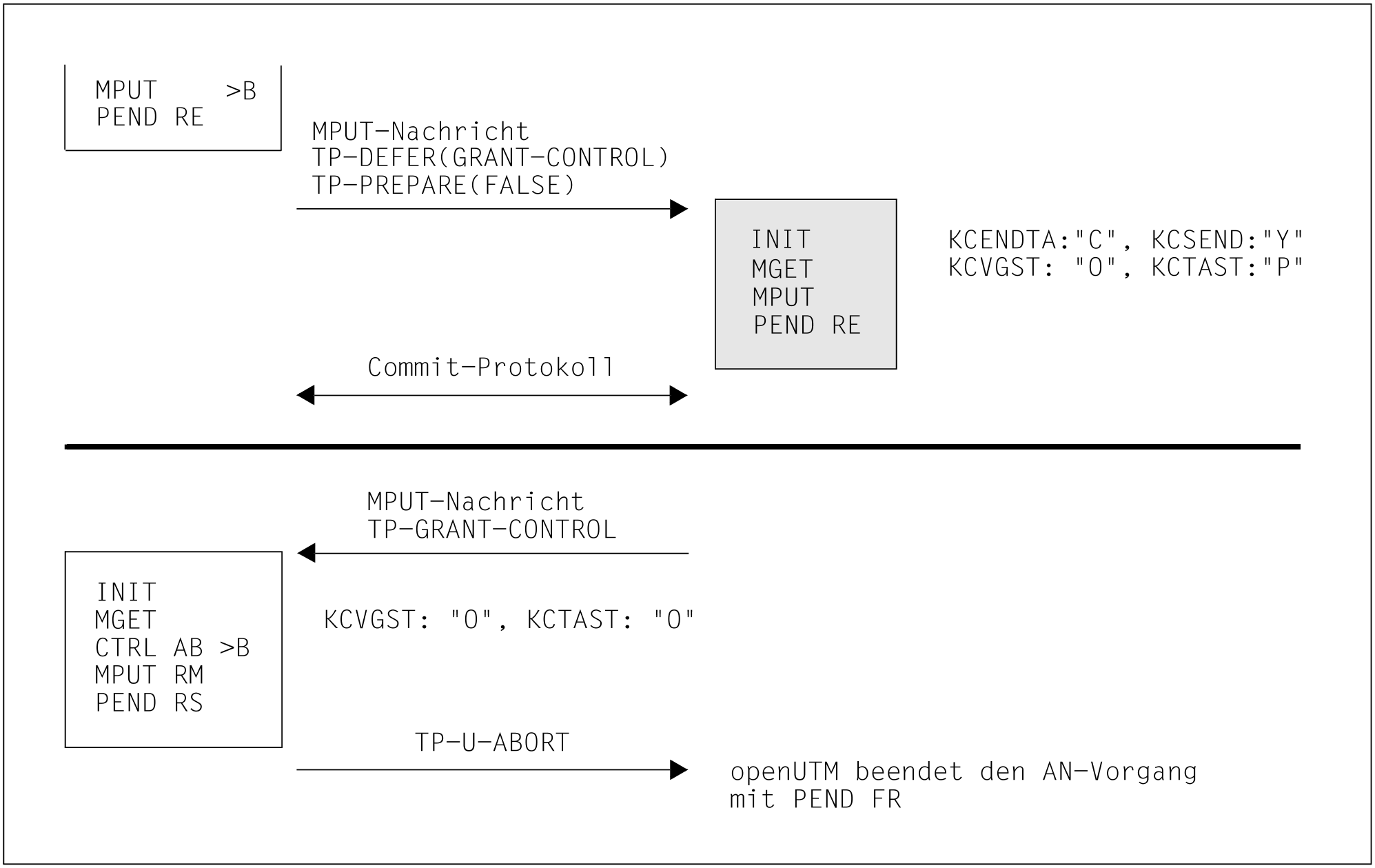 Mit dem CTRL AB wird ein Auftragnehmer-Vorgang abnormal beendet. Nach einem CTRL AB für einen Auftragnehmer, für den die Commit Funktionseinheit ausgewählt ist, muss der Auftraggeber die verteilte Transaktion zurücksetzen, bei einem Auftragnehmer-Dialog ohne Commit nicht.