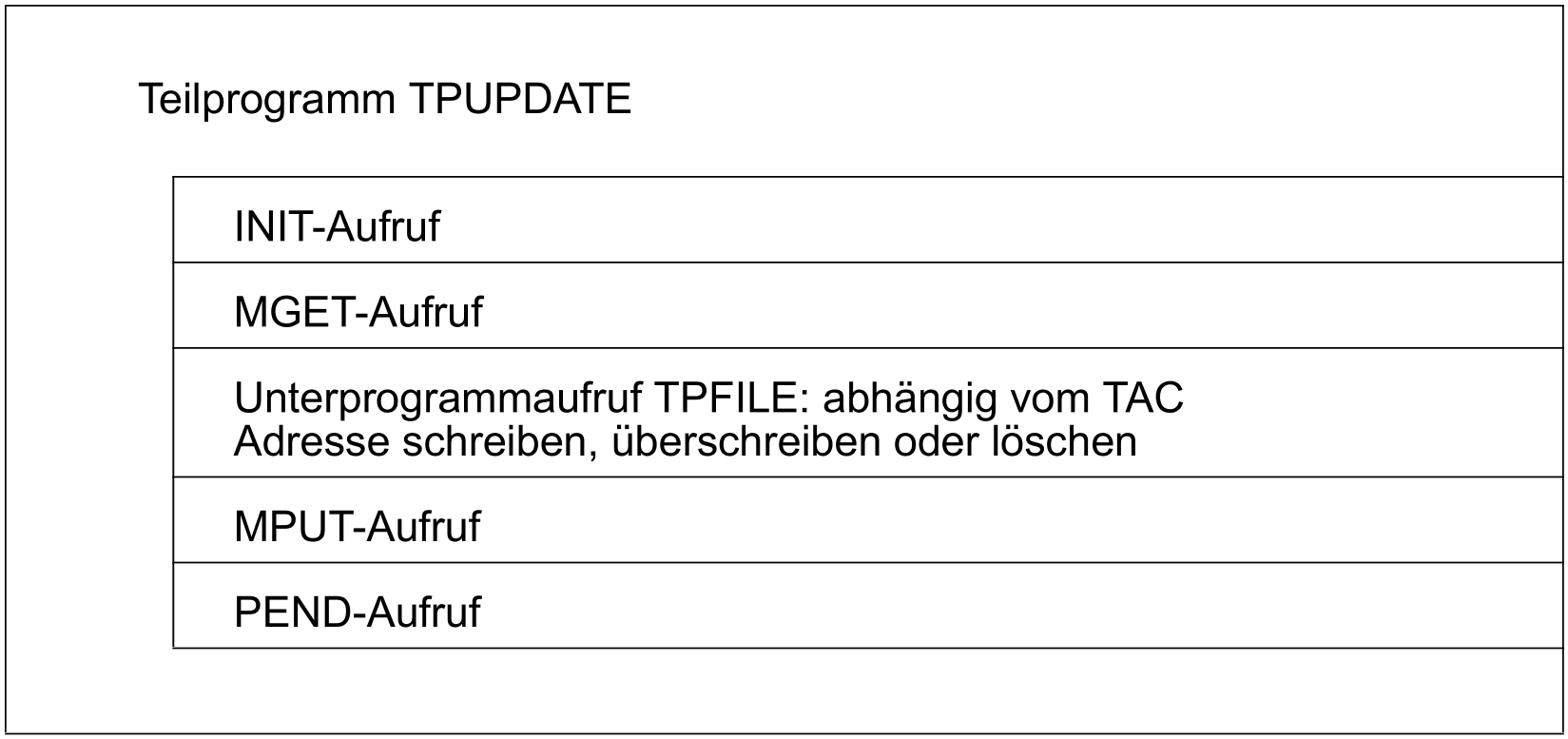 Die oben genannten Ziffern sind die Transaktionscodes (TACs), die die Anwendung steuern. Dabei rufen der Transaktionscode 1 das Teilprogramm "TPREAD" und die Transaktionscodes 2, 3 und 4 das Teilprogramm "TPUPDATE" auf. Diese Teilprogramme verzweigen dann jeweils in das Teilprogramm "TPFILE". Dieses Teilprogramm wird als START- und SHUT-Exit eingesetzt und enthält die Unterprogramme, die die Ein-/Ausgaben auf die Adressdatei durchführen.