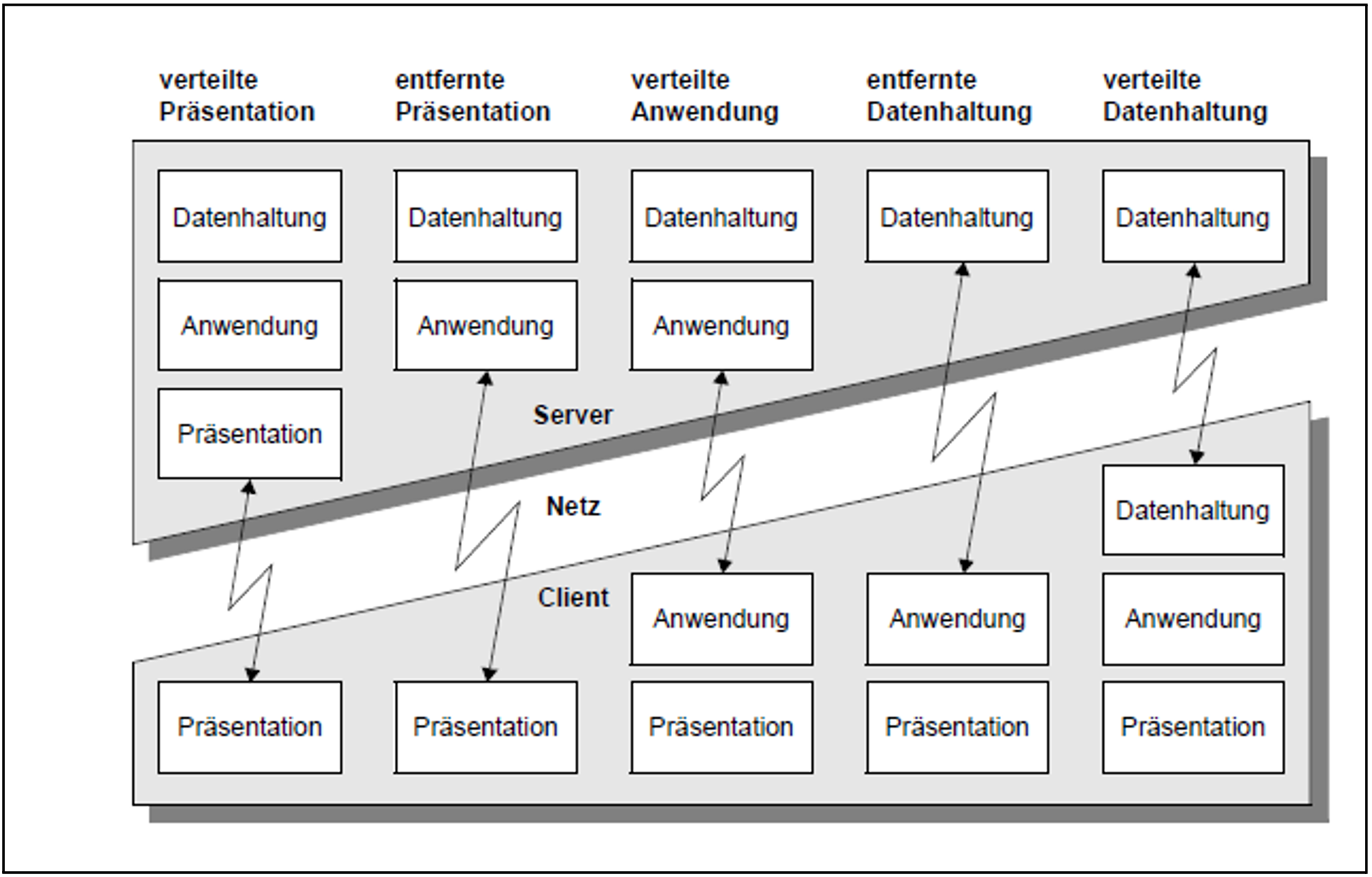 In Bild 12 sind die fünf Client/Server-Basismodelle mit jeweils zwei physischen Software-Tiers dargestellt: