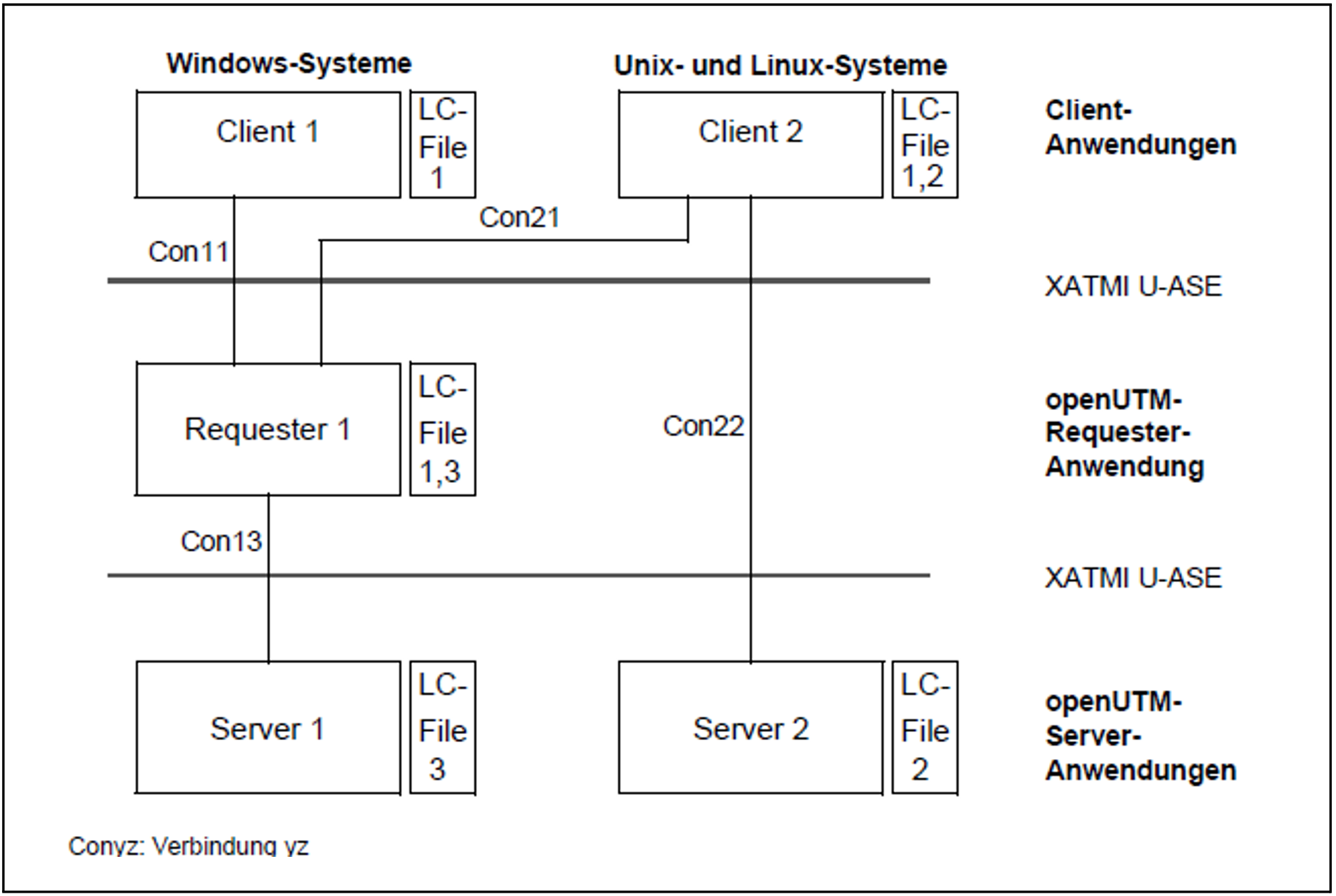 Das folgende Bild zeigt einen Client-Server-Anwendungsverbund, bei dem Clients, Server und Requester miteinander kommunizieren. Sie tauschen ihre typisierten Datenstrukturen (Typisierte Puffer) nach dem Protokoll der „XATMI U-ASE Definition“ aus.