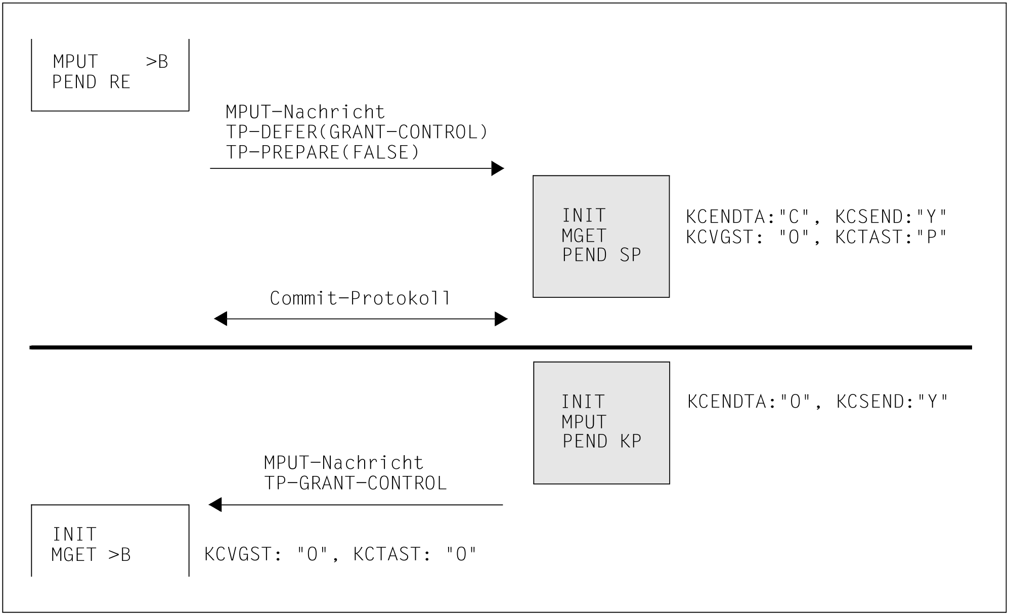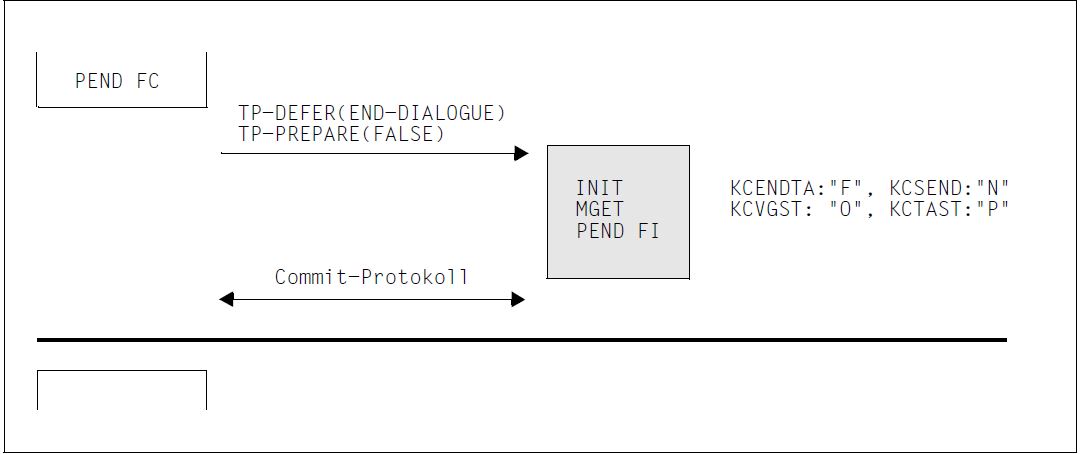 In diesem Fall erhält der Auftragnehmer eine Aufforderung zum Transaktionsende und eine Nachricht vom Auftraggeber, ohne dass der Auftraggeber das Senderecht an den Auftragnehmer abgibt (DATA-PERMITTED=FALSE). Der Auftragnehmer darf keine Nachricht mehr senden. Der Auftraggeber wartet mit dem Start des Folge-Teilprogramms nach dem PEND KP auf den Empfang des TP-READY.