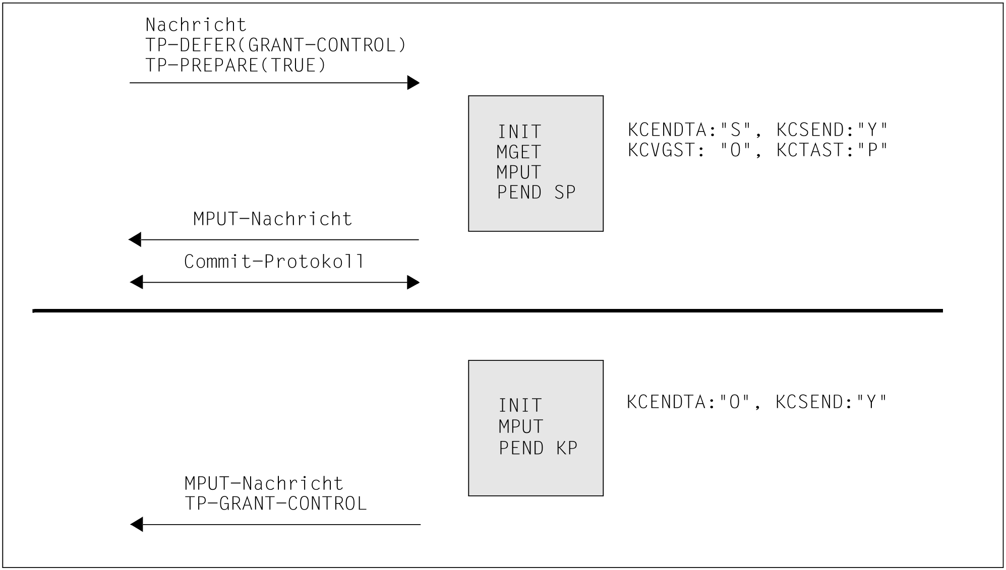 In dem ersten Teilprogrammlauf des Auftraggebers kann statt des PEND SP auch ein MPUT zum Client und ein PEND-Aufruf mit Transaktions- oder Vorgangsende-Anforderung gegeben werden. Es ergibt sich dann folgender Ablauf: