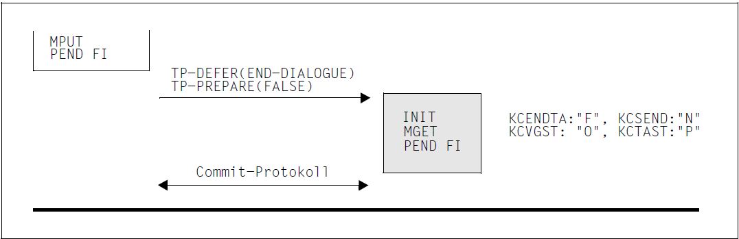 Dieser Fall ist bei der Kommunikation über das OSI TP-Protokoll als Normalfall anzusehen, da die Reihenfolge der KDCS-Aufrufe dem Ablauf des Protokollflusses am besten entspricht. Außerdem liegt hier nach Transaktionsende die Kontrolle im Auftraggeber-Vorgang, wodurch ein Vorgangs-Wiederanlauf erleichtert wird.