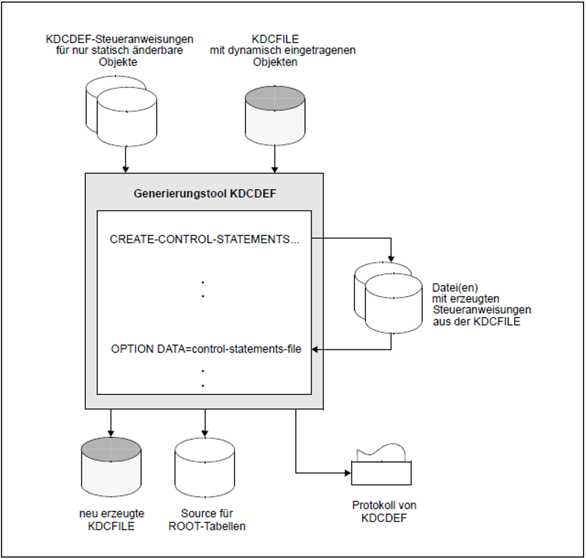 Die folgende Grafik zeigt, wie Sie die Dateien, die der inverse KDCDEF erzeugt, direkt als Input-Dateien an KDCDEF übergeben. Sie können die Dateien aber auch editieren, d.h. vor dem KDCDEF-Lauf modifizieren und später, bei einer Neugenerierung, an KDCDEF übergeben. Jede erzeugte Input-Datei weisen Sie KDCDEF mit der Steueranweisung OPTION DATA=control_statements_file zu.