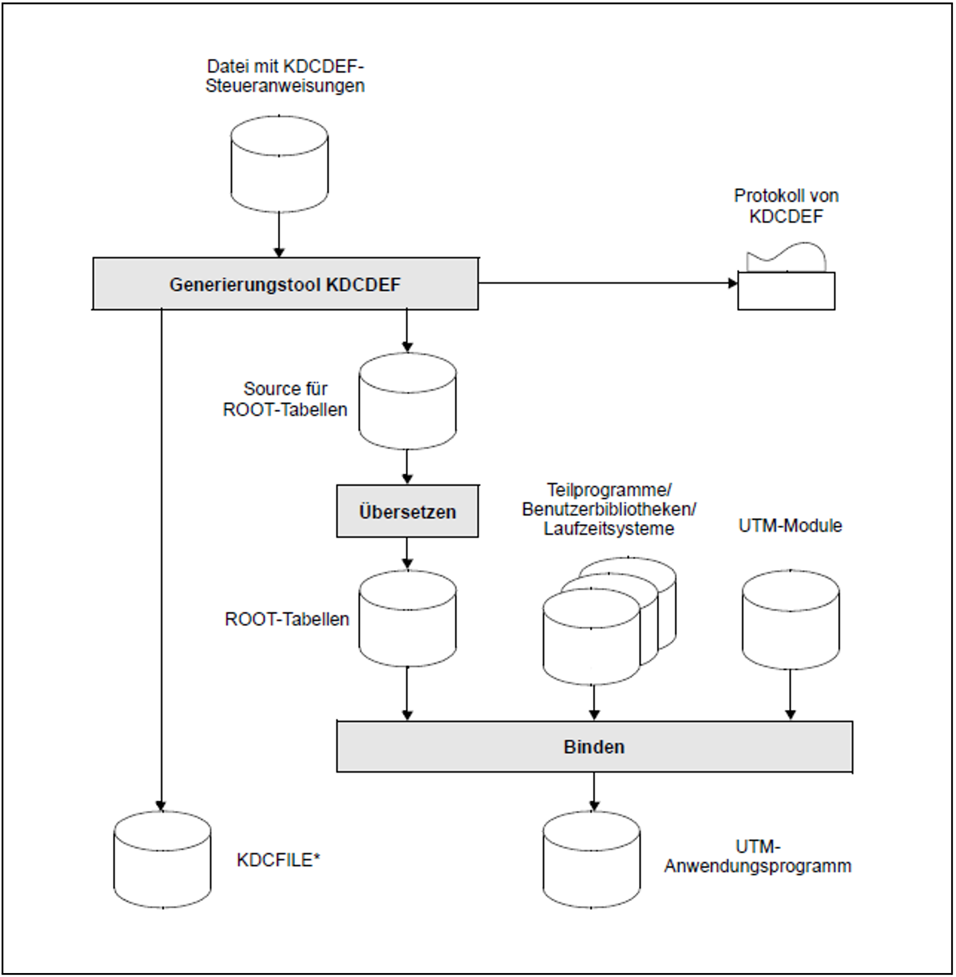 die übersetzten ROOT-Tabellen, Teilprogramme und eventuell weitere Module wie z.B. Format-Bibliotheken, eigene Meldungsmodule oder Sprach-spezifische Laufzeitsysteme zusammen mit UTM-Modulen zum Anwendungsprogramm binden. Dies kann statisch (d.h. vor Anwendungsstart) oder dynamisch (d.h. beim Anwendungsstart) erfolgen.