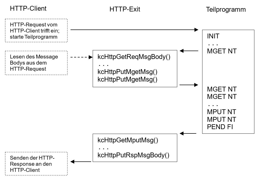 Der HTTP-Exit wird für eine Eingabenachricht nur einmal, zum Zeitpunkt des ersten MGET-Aufrufs aufgerufen und muss dabei die gesamte Eingabenachricht bearbeiten und die Nachrichtenteile für den ersten und alle folgenden MGET-Aufrufe des Teilprogramms erzeugen. Dazu kann der Exit mit den kcHttpGet-Funktionen auf alle Bestandteile eines HTTP-Requests zugreifen z.B. mit der Funktion kcHttpGetReqMsgBody auf den Message Body des HTTP Requests. Mit der Funktion kcHttpPutMgetMsg kann die für das Teilprogramm umformatierte Nachricht bereitgestellt werden. Der Exit hat darüberhinaus die Möglichkeit mittels der Struktur kcHttpExitMsgInfo die Aufteilung der Eingabenachricht in Nachrichtenteile festzulegen. D.h. der Exit bestimmt damit die Anzahl und die Länge der Nachrichtenteile, die das Teilprogramm mit MGET lesen kann.