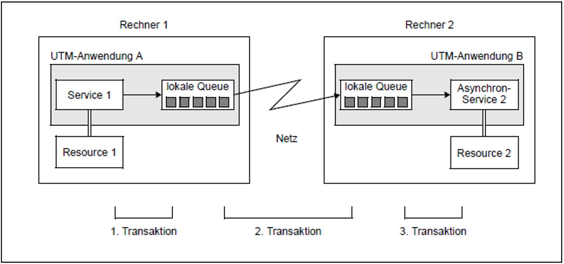 Bild 24 zeigt, wie ein Hintergrundauftrag an eine ferne Anwendung von openUTM behandelt wird. Das Bild macht auch deutlich, dass Remote Queuing in vielen Fällen eine sinnvolle Alternative zur verteilten Dialogverarbeitung darstellt: Die Kommunikation zwischen den beiden Services gliedert sich in drei transaktionsgesicherte Schritte. Sobald der Auftrag in die lokale Queue der Anwendung A eingetragen ist, können die benötigten Betriebsmittel in Anwendung A freigegeben und eventuell gesetzte Sperren in Resource 1 wieder aufgehoben werden - auch wenn das Netz gerade nicht verfügbar ist oder die Anwendung B nicht läuft.