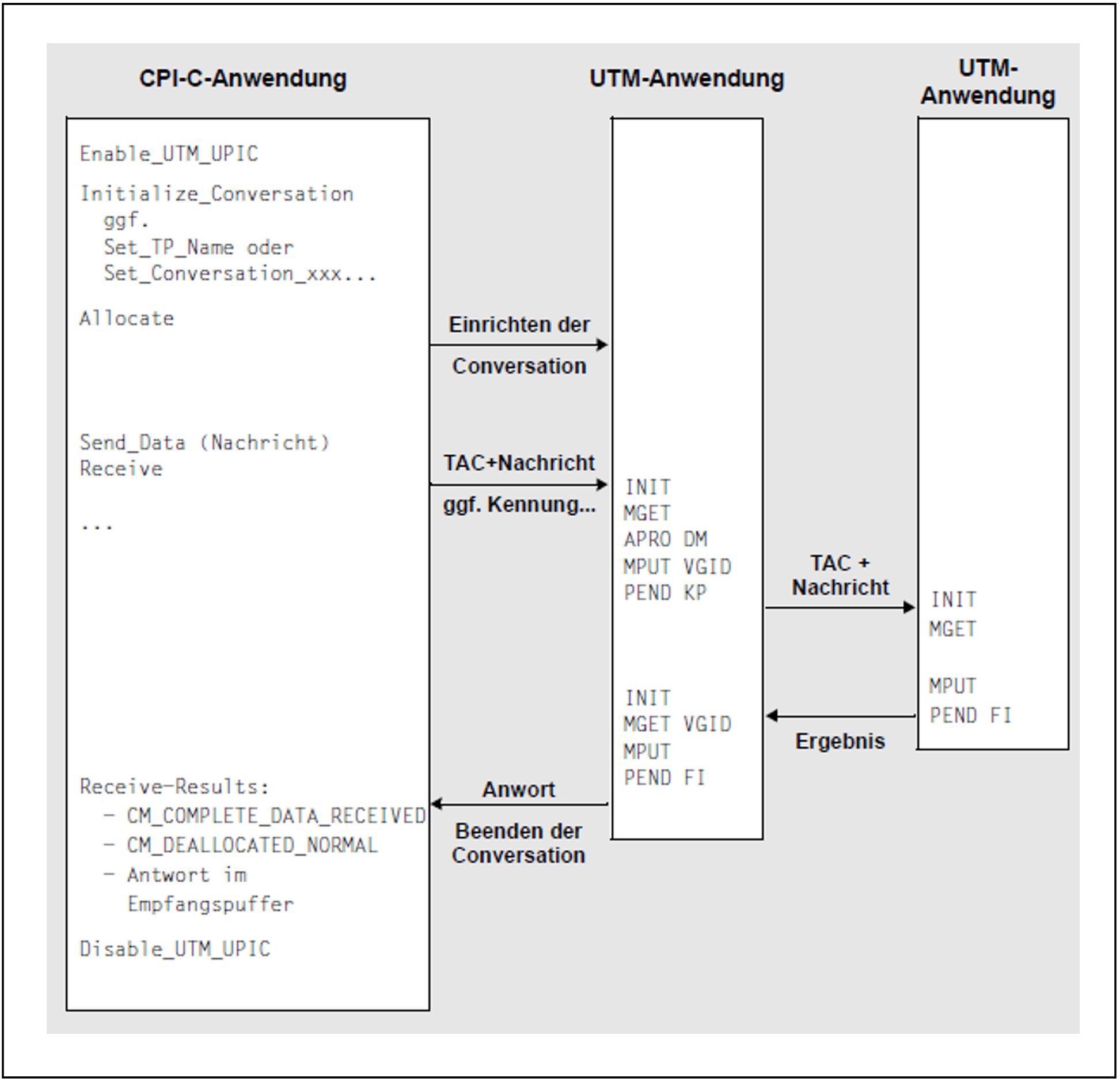 Das nachfolgende Bild zeigt eine mögliche Form der Zusammenarbeit zwischen einer CPI-C-Anwendung und einer UTM-Anwendung bei einem Mehrschritt-Vorgang. In diesem Beispiel wird auf der UTM-Seite eine verteilte Transaktionsverarbeitung zwischen zwei UTM-Anwendungen veranlasst.