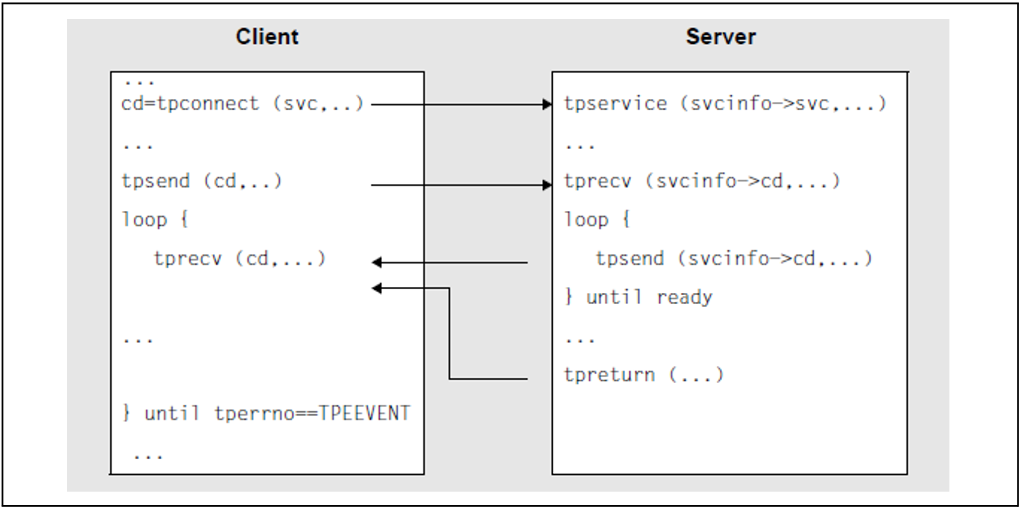Beim Conversational Modell wird die Conversation zu einem Service explizit mit dem Aufruf tpconnect() aufgebaut. Solange sie besteht, können Client und Server mit tpsend() und tprecv() Daten austauschen. Dieser „Dialog“ ist jedoch kein Dialog im Sinne von OSI-TP und es kann nur eine Transaktion abgewickelt werden.