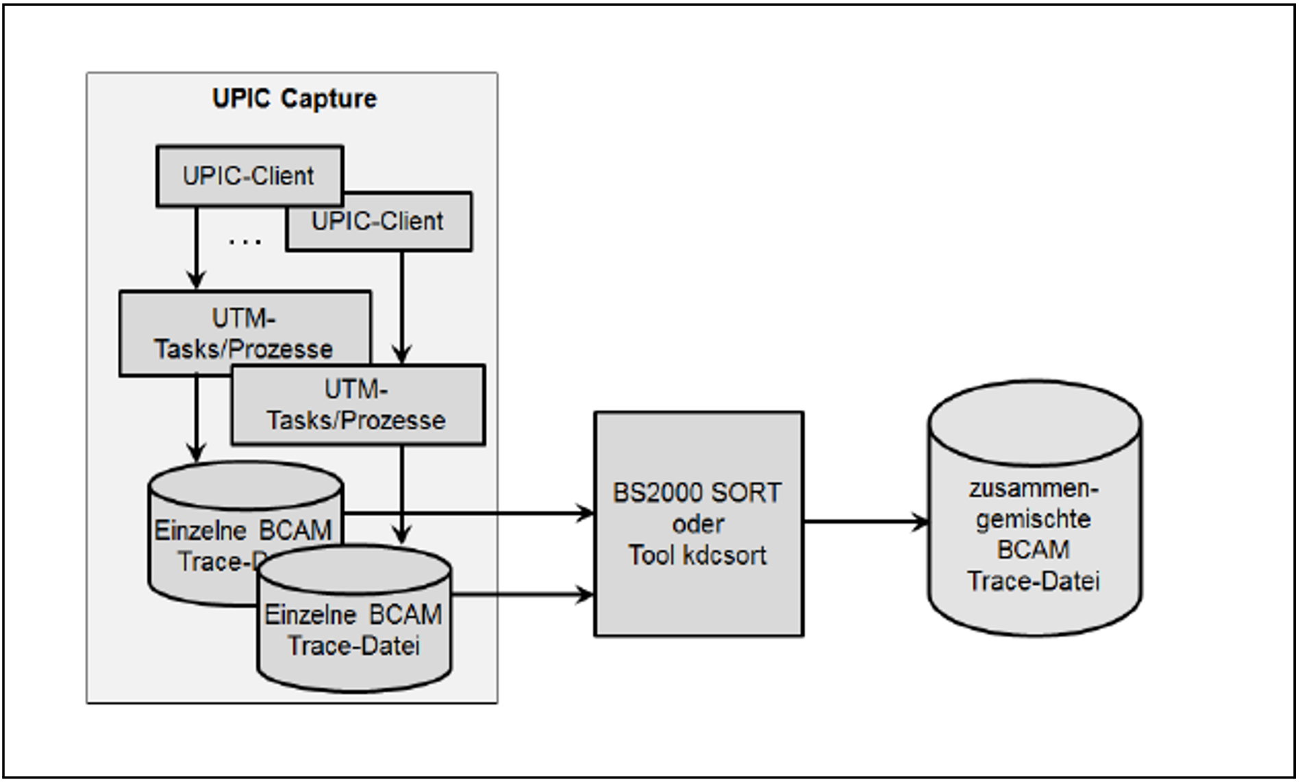 Zum Mitschneiden von UPIC-Sessions (Capture) wird die Trace-Funktion BTRACE (BCAM-Trace) verwendet, die auf allen Server-Plattformen vorhanden ist.