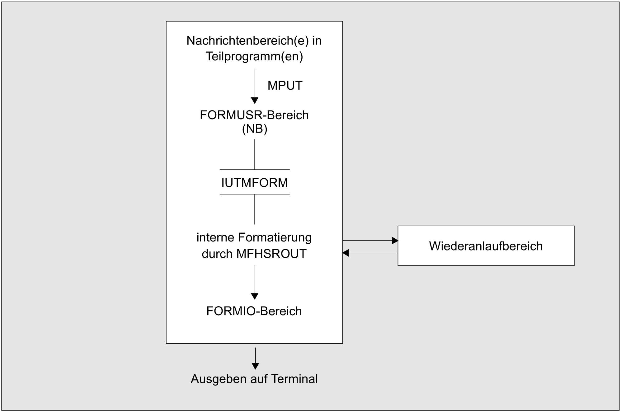 Die Nachrichten aus den Teilprogrammen kommen zur Formatierung einer Ausgabenachricht über UTM-Zwischenspeicher in den FORMUSR-Bereich. Die Größe dieses Bereichs, der die gesamte logische Nachricht aufnehmen können muss, wird im Operand NB der MAX-Anweisung vom Anwender festgelegt (siehe openUTM-Handbuch „Anwendungen generieren“). Diese Nachricht wird vom FHS-Formatierungsprogramm MFHSROUT formatiert, die formatierte Nachricht im FORMIO-Bereich abgelegt. Diese Nachricht wird an das Terminal gesendet.