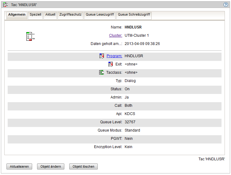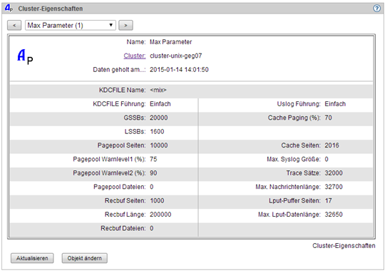 Unter den Seiten sind im Allgemeinen die Buttons 'Aktualisieren', 'Objekt ändern' und eventuell 'Objekt löschen' angeordnet. Eventuell gibt es auch noch weiter Buttons, die objektspezifische Funktionen zugänglich machen.