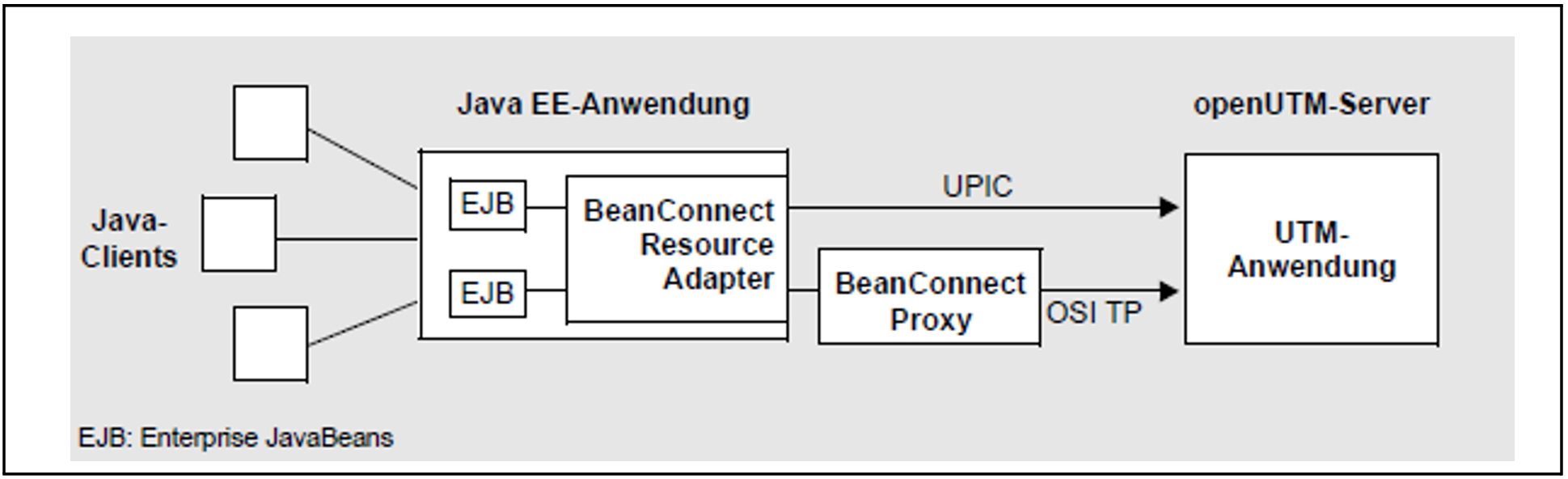 Diese Kopplungsart entspricht aus UTM-Sicht einer klassischen Anbindung eines Client über das UPIC-Protokoll, siehe Abschnitt „Clients mit Trägersystem UPIC“. Dadurch kann die Java EE Anwendung jeden UTM-Dialog-TAC aufrufen, jedoch keine Asynchron-TACs.