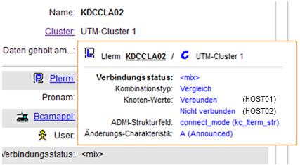 Der Kombinationstyp "Vergleich" gibt an, dass der Wert "<mix>" durch den Vergleich der zugrundeliegenden Eigenschaftswerte der Knoten-Anwendungen ermittelt wurde. Sind die Werte nicht gleich (wie in diesem Fall), dann werden die einzelnen Knoten-Werte ausgegeben. Hinter den Knoten-Werten steht in Klammern der Hostname des betreffenden UTM-Cluster-Knotens.