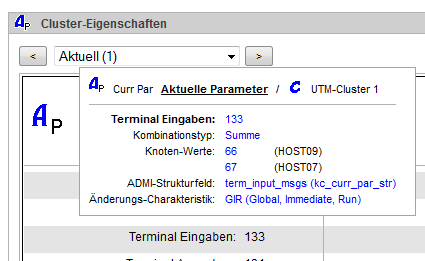 Da WebAdmin auf Cluster-globalen Eigenschaftsseiten die Eigenschaftswerte der einzelnen aktivierten Knoten-Anwendungen zu einem Wert zusammenfasst, kann es je nach Eigenschaft auch zum Zustand "<mix>" kommen. Im Quickinfo zu einem solchen Eigenschaftswert, werden auch die einzelnen Werte der Knoten-Anwendungen angezeigt, so dass man sofort sehen kann, aus welchen Einzelwerten sich der Wert "<mix>" zusammensetzt. Auch Eigenschaften, die durch Summen- oder Durchschnittsbildung zusammengefasst werden, können so leichter interpretiert werden. Neben den Einzelwerten der Knoten-Anwendungen wird auch noch der "Kombinationstyp" ausgegeben, der angibt, auf welche Weise die Einzelwerte von WebAdmin zusammengefasst worden sind.
