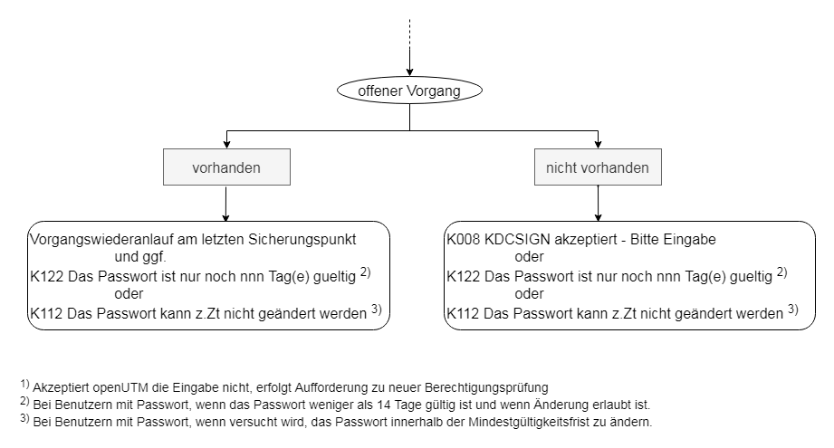 Wird das Passwort innerhalb der nächsten 14 Tage nach der Anmeldung ungültig, warnt openUTM den Benutzer mit einer K-Meldung, sofern die minimale Gültigkeitsdauer des Passworts eine Änderung zu diesem Zeitpunkt erlaubt. Ein Passwort kann der Benutzer wie unter „Eingabe des Passworts"“ beschrieben ändern.