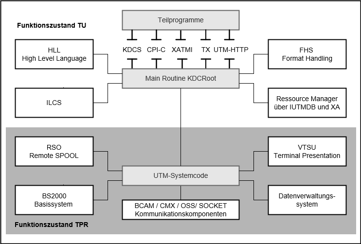 Der Systemcode einer UTM-Anwendung (der Monitor) läuft überwiegend im privilegierten Zustand (TPR) und nutzt zentrale BS2000- und openNetworking-Funktionen.