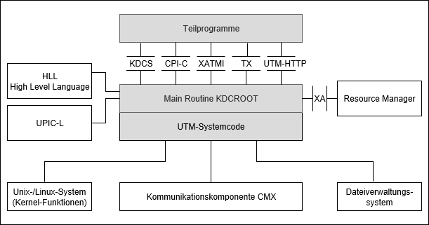 Die Teilprogramme nutzen die Funktionen über die Programm-Schnittstellen von openUTM, also über die X/Open-Schnittstellen CPI-C und XATMI + TX oder über die Schnittstelle KDCS (nationaler Standard).