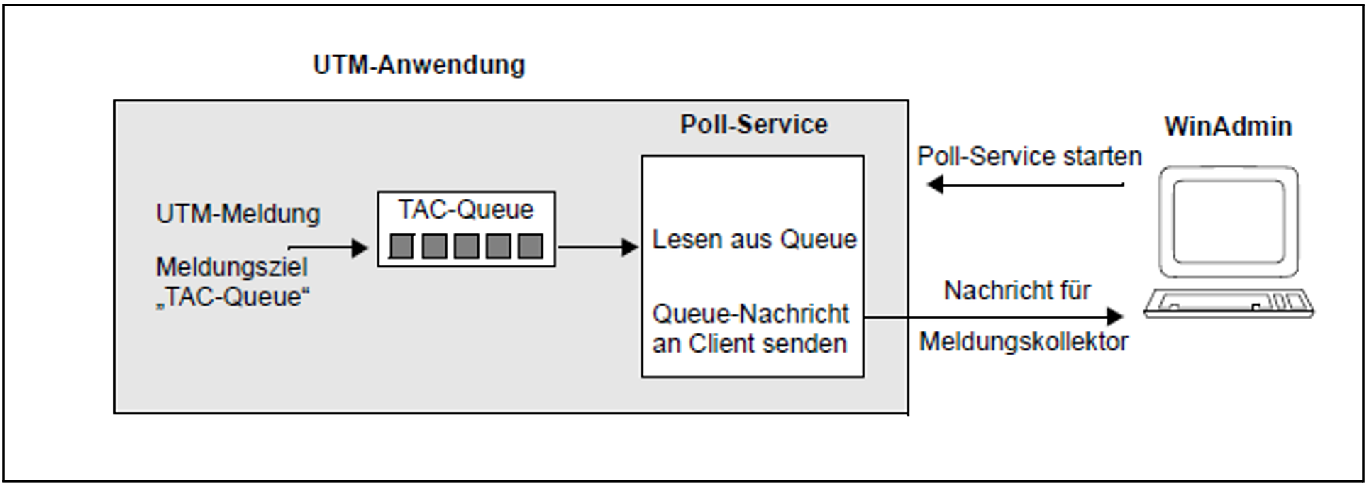 Der Meldungskollektor wird in WinAdmin definiert. Er stellt einen Polling-Mechanismus dar, der die UTM-Meldungen - je nach Einstellung in WinAdmin - entweder zyklisch oder auf explizite Anforderung aus der TAC-Queue abholt. Auf UTM-Seite muss in diesem Fall nur die TAC-Queue generiert und ein Meldungsmodul erzeugt werden, in dem festgelegt ist, welche Meldungen an die TAC-Queue gesendet werden sollen.