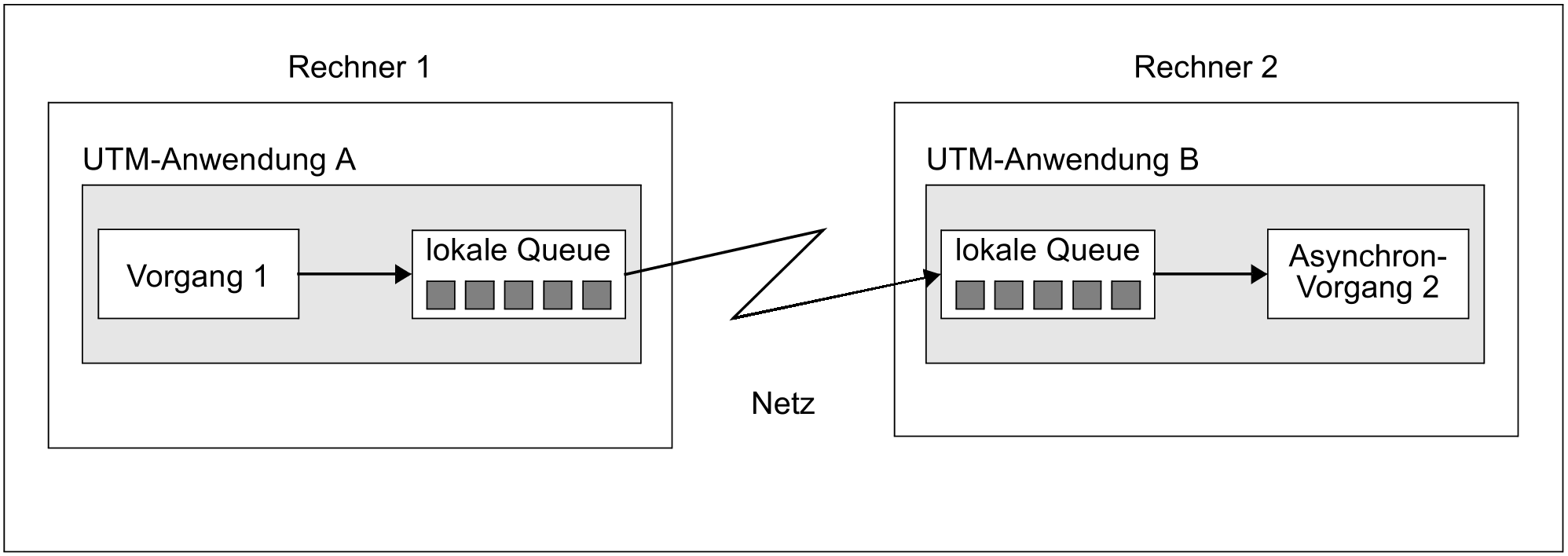 openUTM arbeitet bei Asynchron-Aufträgen an ferne Anwendungen mit zwei jeweils lokalen Queues: eine Queue liegt dabei in der Sender-Anwendung, die andere Queue beim Empfänger. Durch dieses Deferred Delivery-Prinzip ist das rechnerübergreifende Message Queuing mit openUTM vollständig unabhängig davon, ob gerade eine Verbindung besteht oder nicht: Falls keine Verbindung aufgebaut werden kann, bleibt der Auftrag solange in der lokalen Sender-Queue, bis eine Verbindung hergestellt ist. Nach Verbindungsaufbau gilt:
