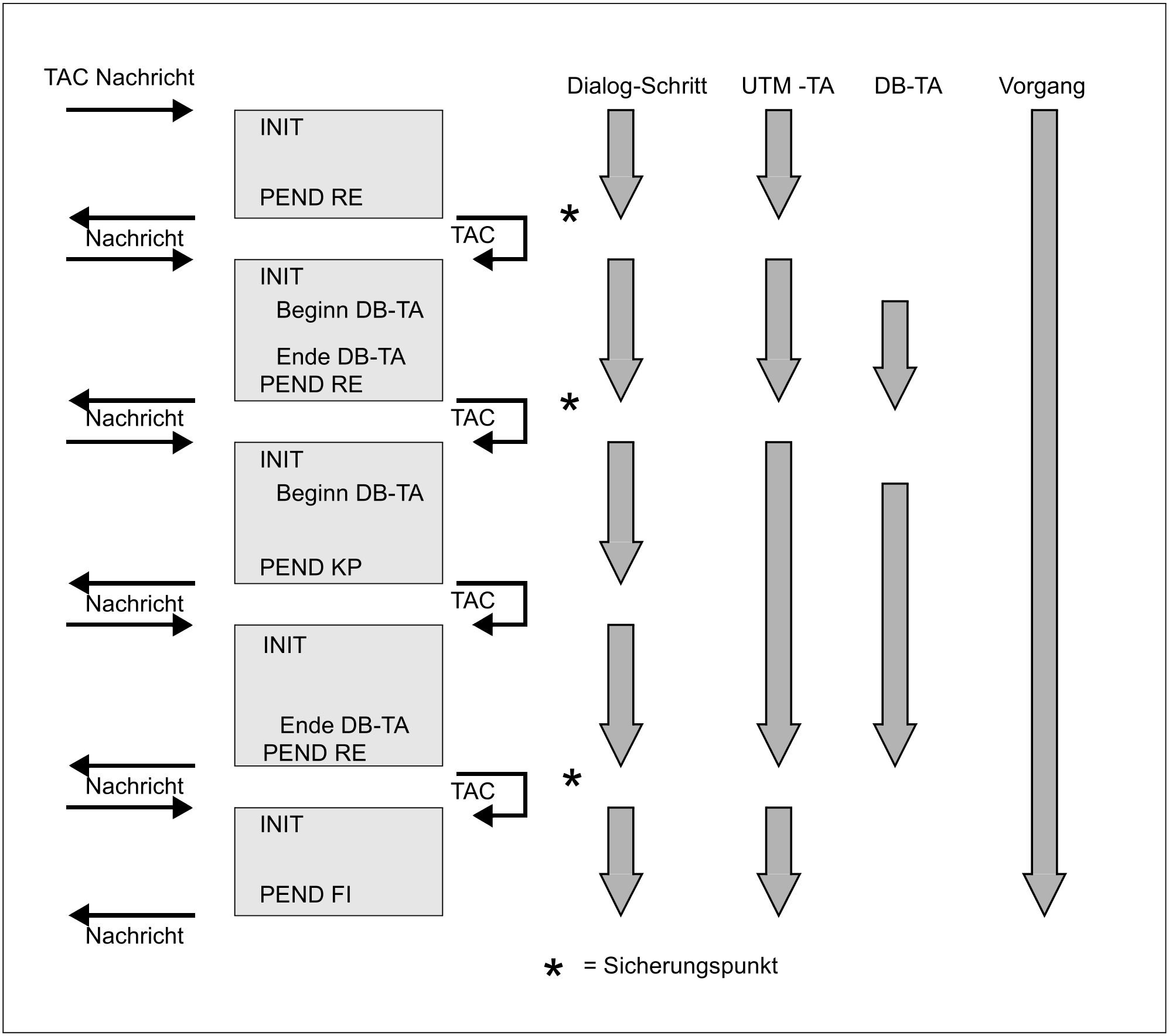 Ein Vorgang ist in eine oder mehrere UTM-Transaktionen strukturiert. Diese Strukturierung wird von den Teilprogrammen des Vorgangs bestimmt. Eine DB-Transaktion wird von den Teilprogrammen bei Bedarf eröffnet, also wenn lesende oder ändernde Zugriffe auf die Datenbanken notwendig sind.